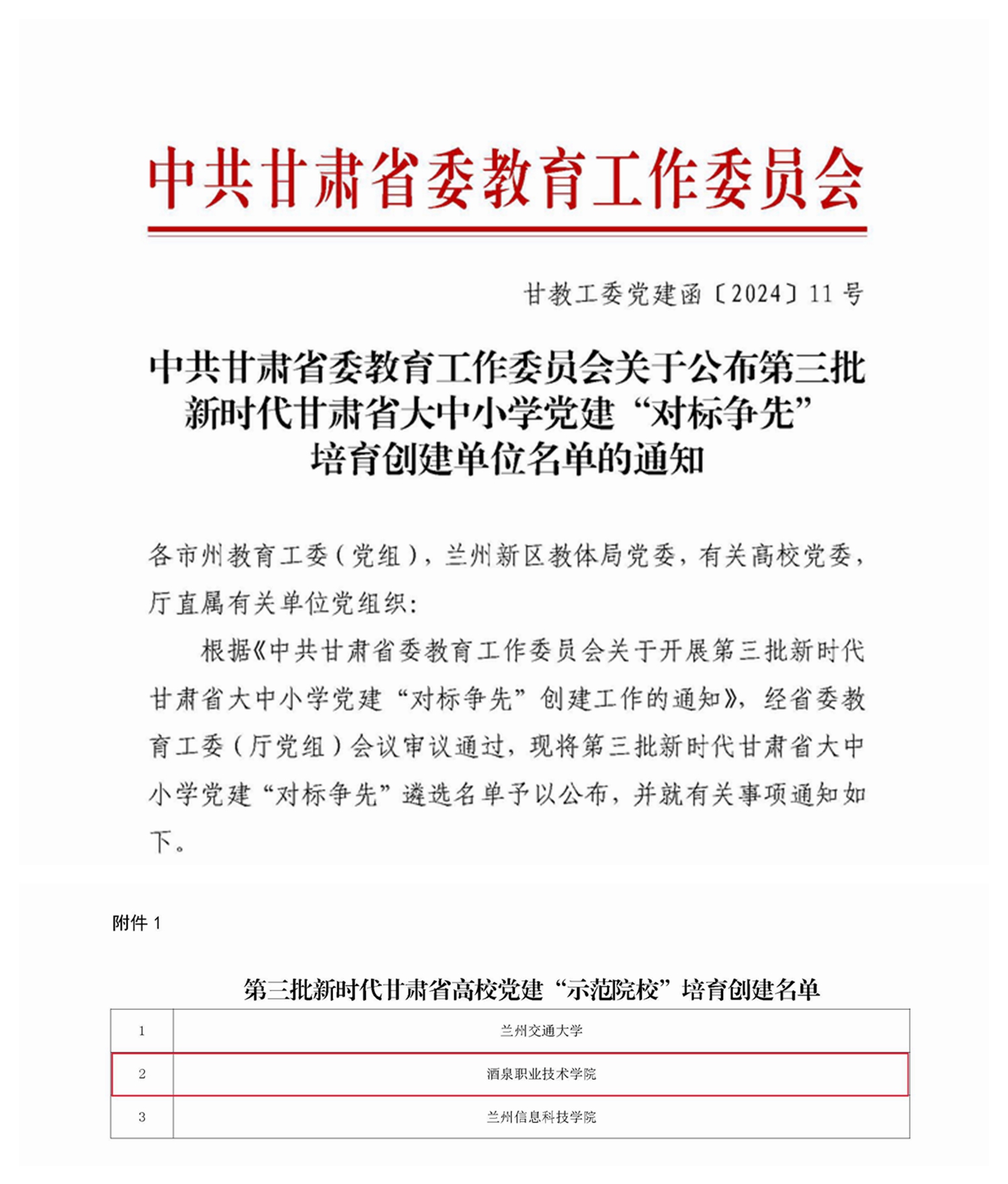 要闻快递 > 正文酒泉职业技术学院入选第三批新时代甘肃省高校党建“示范院校”培育创建单位