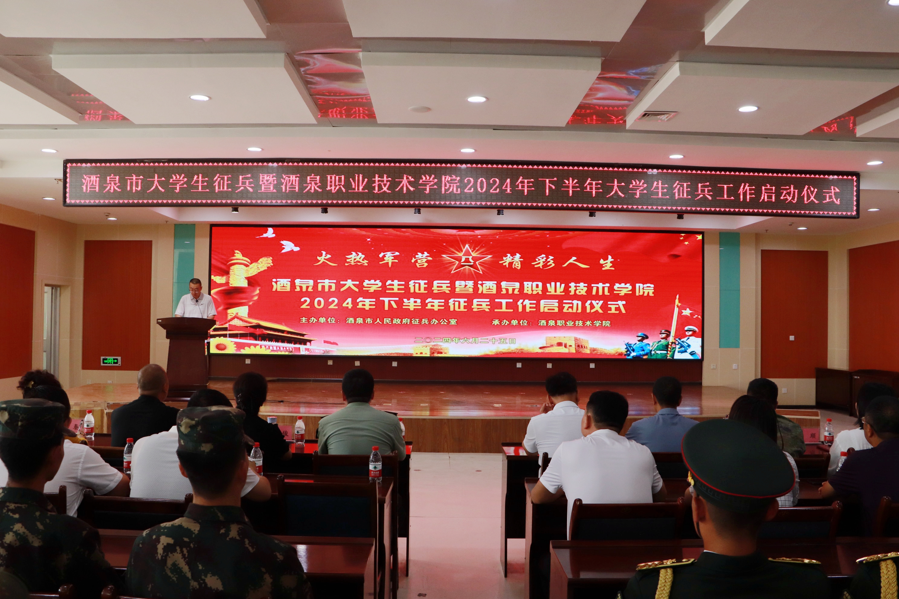要闻快递 > 正文6月25日下午,酒泉市大学生征兵暨酒泉职业技术学院2024年下半年征兵工作启动仪式在图书馆四楼会议室举行。酒泉市征兵办公室主任、酒泉军分区大校副司令员陈东伟,酒泉市委教育工委委员、市教育局二级调研员赵志俊,共青团酒泉市委副书记王昊楠,共青团酒泉市委青年发展部副部长崔海霞,酒泉市人社局三级调研员、酒泉市人社局就业科副科长刘世生,肃州区委常委、肃州区人武部上校部长张晓飞等相关领导出席活动。酒泉职业技术学院党委委员、副校长施荣出席启动仪式并致辞。学校党委征兵工作站工作人员和各学院负责征兵工作的辅导员及学生代表共400余人参加。