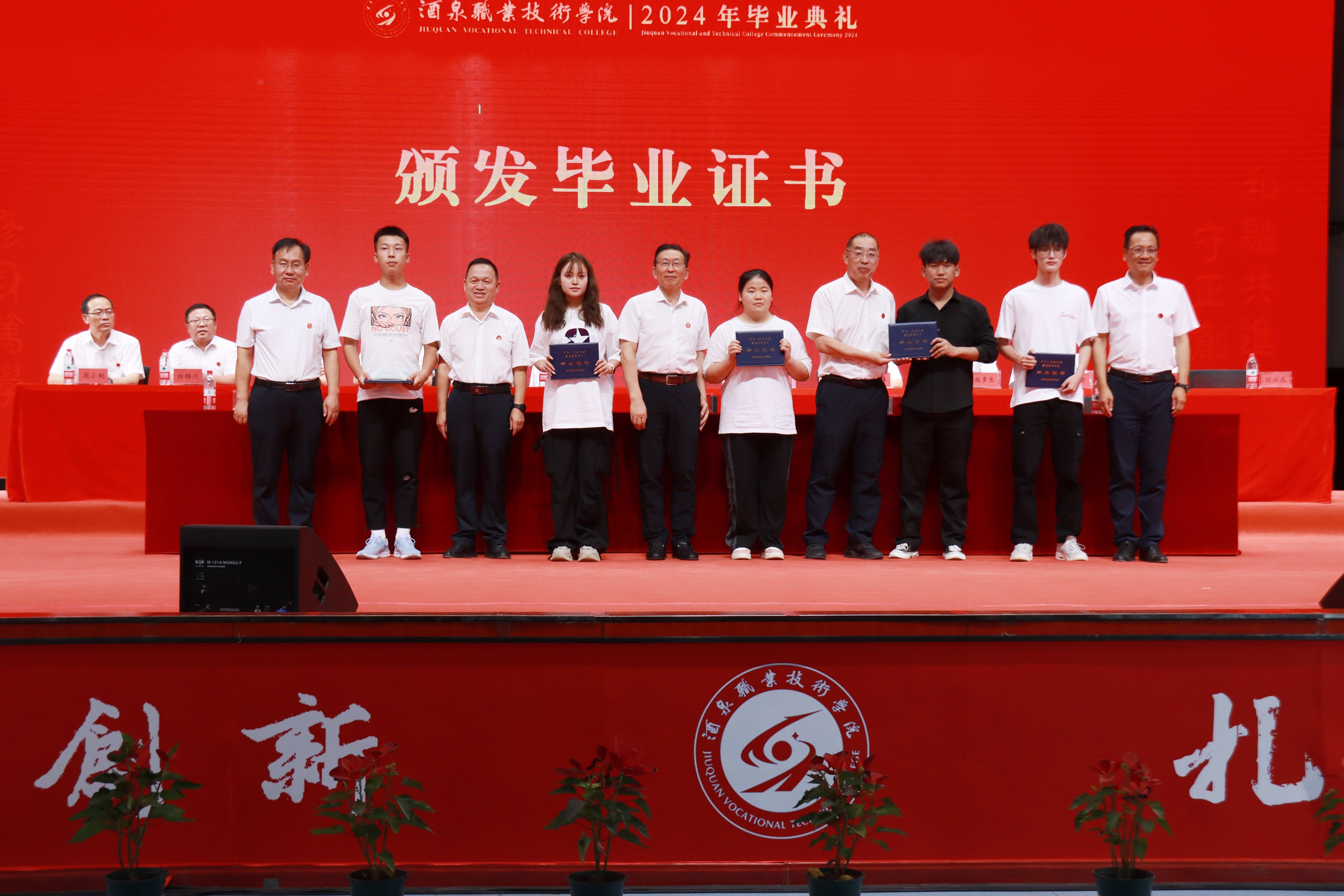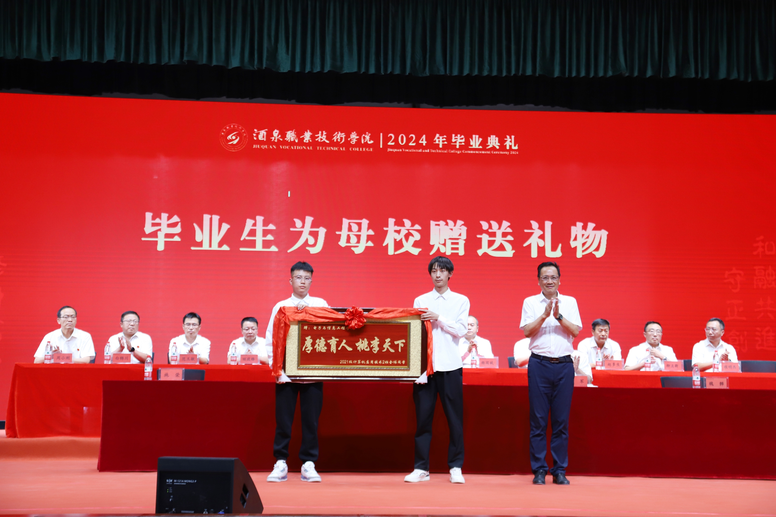 会上,宣读了《酒泉职业技术学院2024届毕业生名单》《甘肃省教育厅关于认定2024届全省普通高校优秀毕业生的通知》《酒泉职业技术学院关于表彰2024届优秀毕业生的决定》,并为毕业生代表颁发了毕业证书。电子与信息工程学院毕业生代表2024届毕业生为母校赠送了礼物。优秀校友2009届作物生产技术专业、酒泉鑫龙农业开发有限公司总经理李岩龙以及2024届毕业生代表、教师代表分别作了发言。