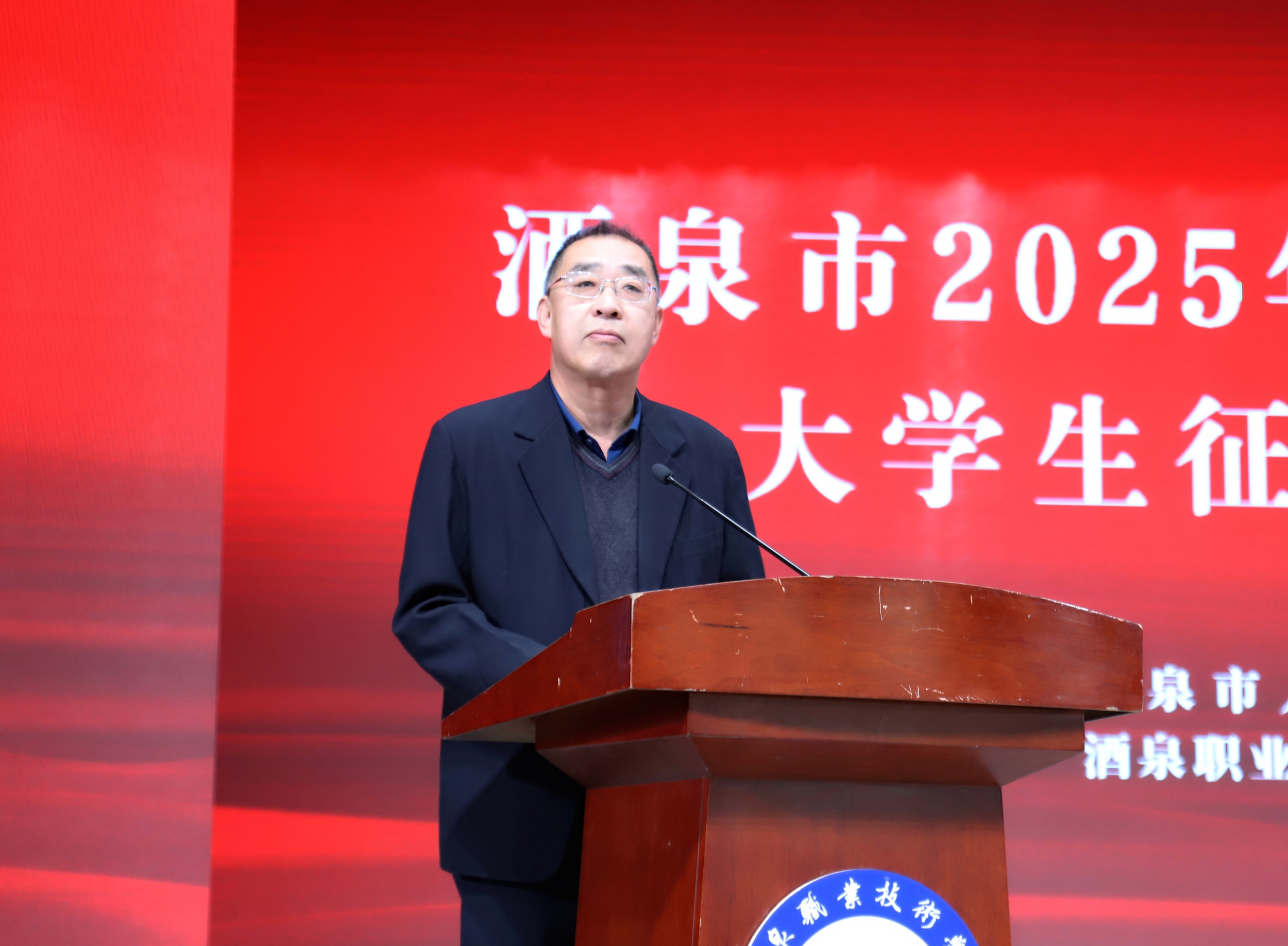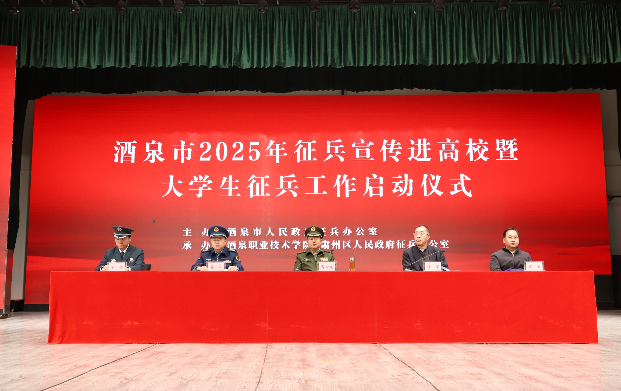 要闻快递 > 正文2024年12月20日,酒泉市2025年征兵宣传进高校暨大学生征兵工作启动仪式在酒泉职业技术学院举办。酒泉市委常委、酒泉市征兵和民兵工作领导小组常务副组长、军分区大校司令员曹世龙,酒泉职业技术学院党委副书记、校长许军,酒泉职业技术学院党委委员、副校长施荣,酒泉军分区动员处副处长毕铭、肃州区退役军人事务局局长韩建斌等出席启动仪式。肃州区人武部上校部长娄江主持活动。