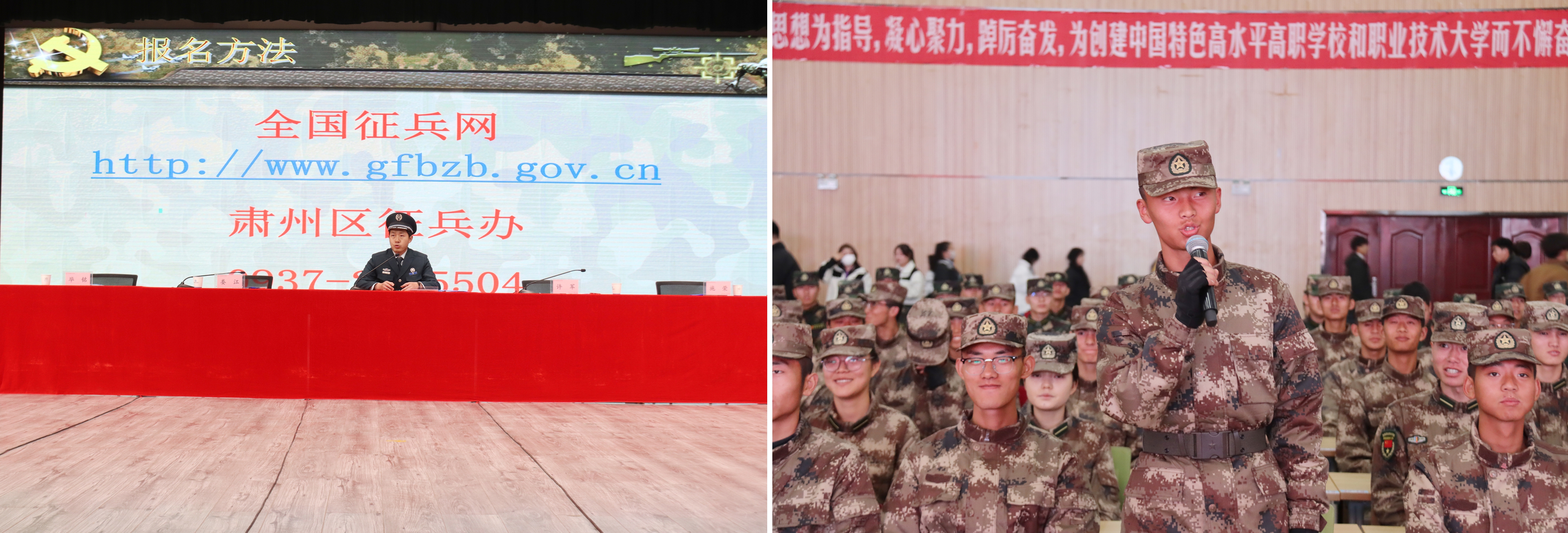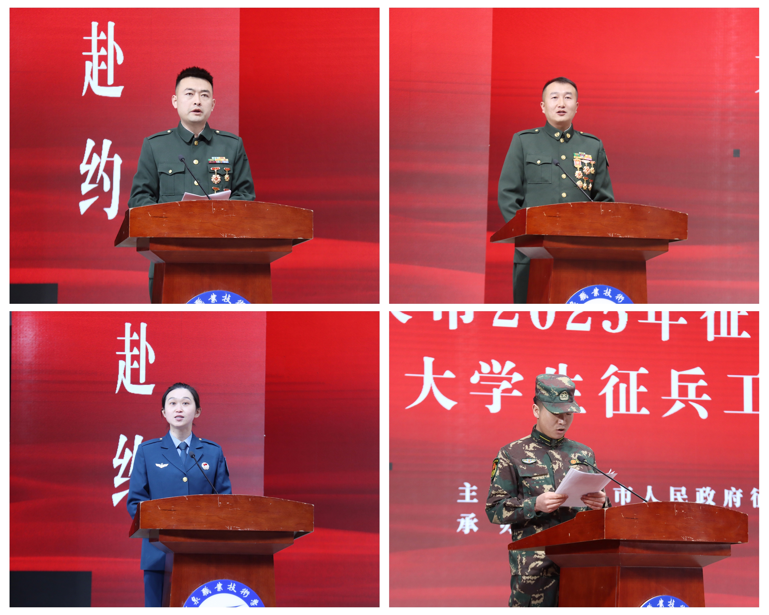 三名优秀退役军人代表陈冠德、王志鹏、王雪结合自身经历,分享了他们积极参军报国、在军营成长成才的收获,事迹感人肺腑,榜样精神催人奋进。酒泉职业技术学院志愿参军大学生代表常福强表达了自己立志国防、投身强军的远大志向,并向全体同学发起了入伍倡议。