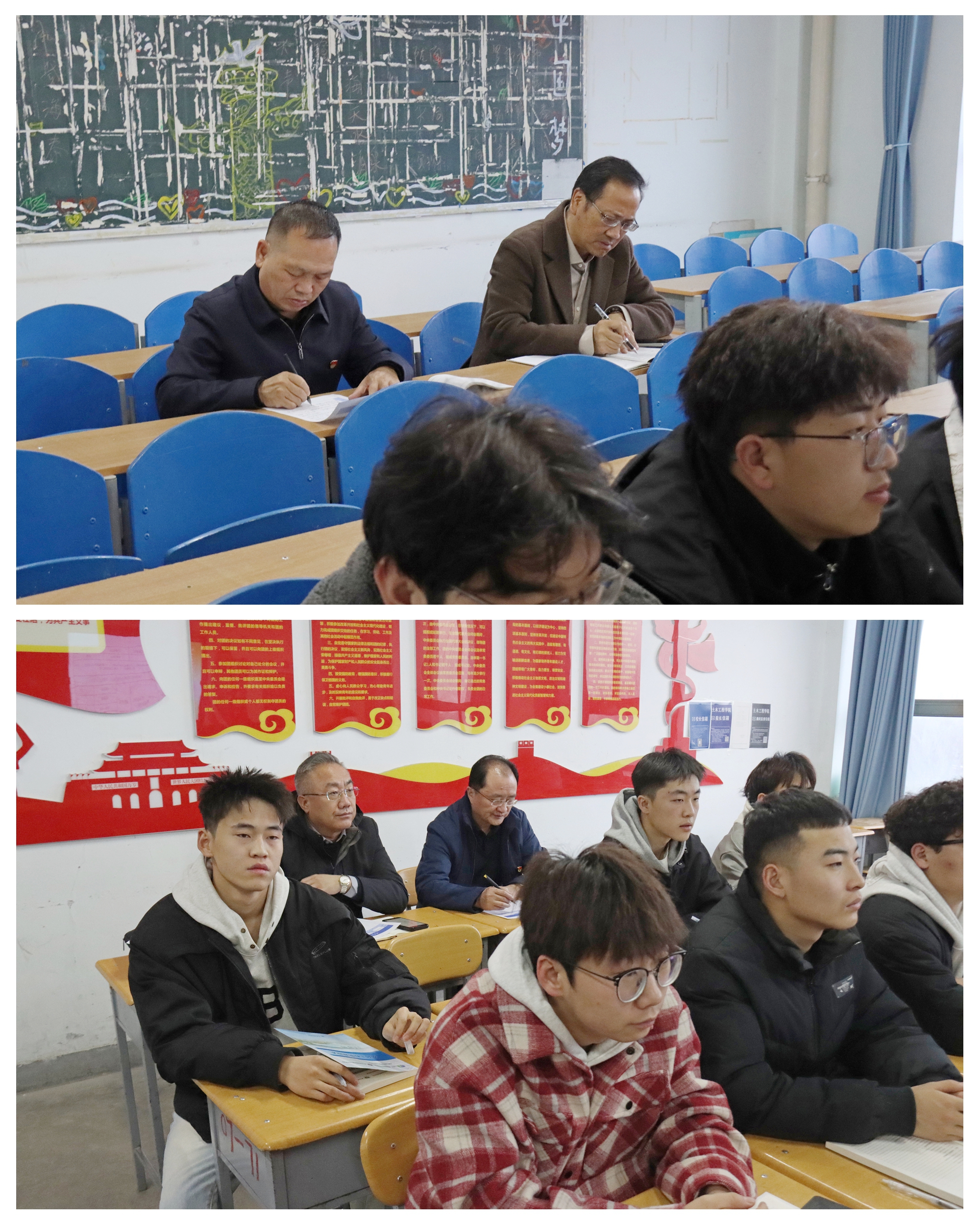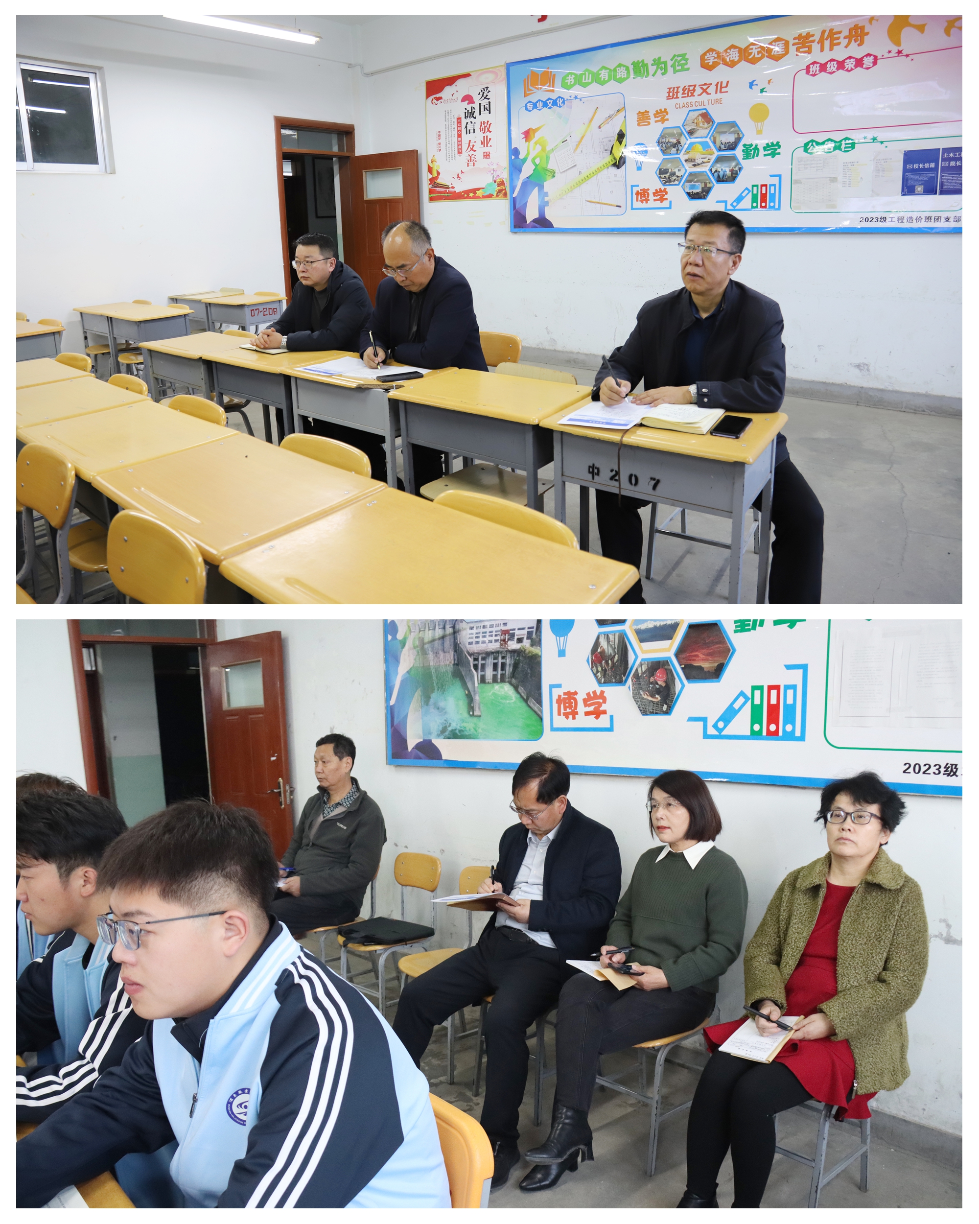 校领导分为6组,随机听取了《中华优秀传统文化》《水利工程管理》《物流营销》《水利水电工程造价与招投标》等多门课程。课堂上,任课教师精神饱满,讲解生动,互动频繁,秉承现代职业教育理念,以学生为中心,以能力为本位,精心设计教学内容,巧妙运用教学方法,将思政元素有机融入专业课程,引导学生树立正确的价值观、职业观,充分展现了扎实的专业素养和精湛的教学技艺。学生们精神饱满,认真聆听教师的讲解,展现出对新知识的渴望和对学习的热情。随着课程的深入,学生们积极参与互动,踊跃回答问题,展现出活跃的思维和良好的学习态度。听课过程中,校领导认真记录教师授课内容,仔细观察学生的课堂表现,并对教学环境、教学设备等进行了细致检查。