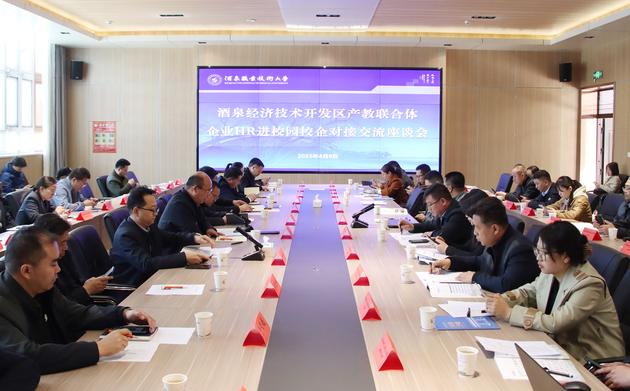 为进一步增进校企双方了解,精准对接人才培养模式和产业用工需求。2025年4月9日上午,学校与酒泉经开区管委会共同举办酒泉经济技术开发区产教联合体企业HR进校园校企对接交流活动,45家市域内企业HR应邀参加。本次活动分为实地参观和座谈会两个阶段。酒泉经开区(高新区)管委会副主任王涛出席交流活动。活动由学校党委委员、副校长杨洁主持。
