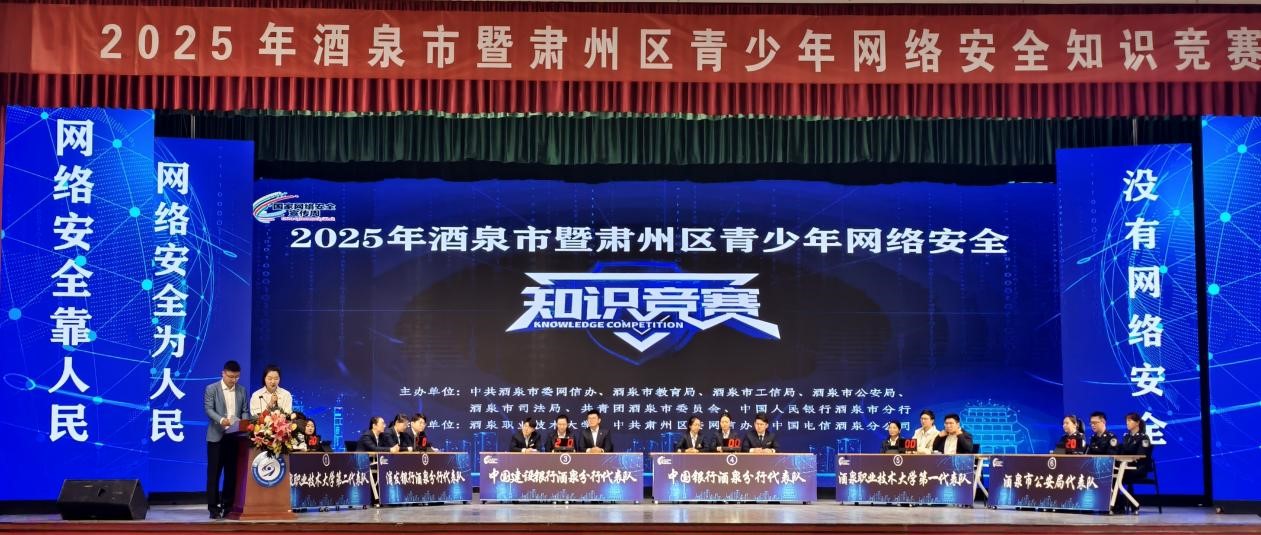 2025年4月28日,由中共酒泉市委网信办、酒泉市教育局、酒泉市公安局等七部门共同主办,酒泉职业技术大学等单位承办的“2025年酒泉市暨肃州区青少年网络安全知识竞赛”在酒泉职业技术大学成功举办。市委宣传部副部长、市委网信办主任王晓东,市政府教育督导团督学陈维明,市公安局党委委员、副局长魏海涛,市司法局党组成员张洪忠,团市委副书记王昊楠,学校党委委员、副校长杨洁等领导出席活动。共有来自各县(市、区)、市直各相关部门单位、高校、社区、金融机构、网络运营商等组成的24支代表队参赛。