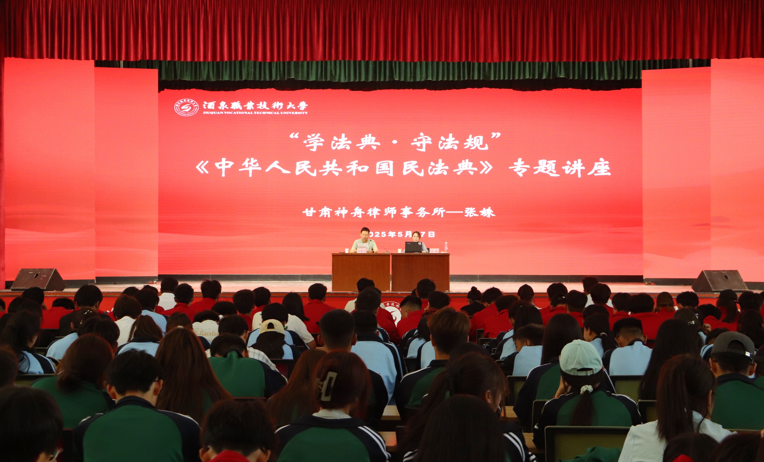 2025年5月27日下午,学校邀请甘肃神舟律师事务所张姝律师走进校园,开展“学法典▪守法规”民法典专题讲座。师生代表近600余人在学校胡杨文化活动中心聆听,讲座由学校党委委员、办公室主任冯黎成主持。