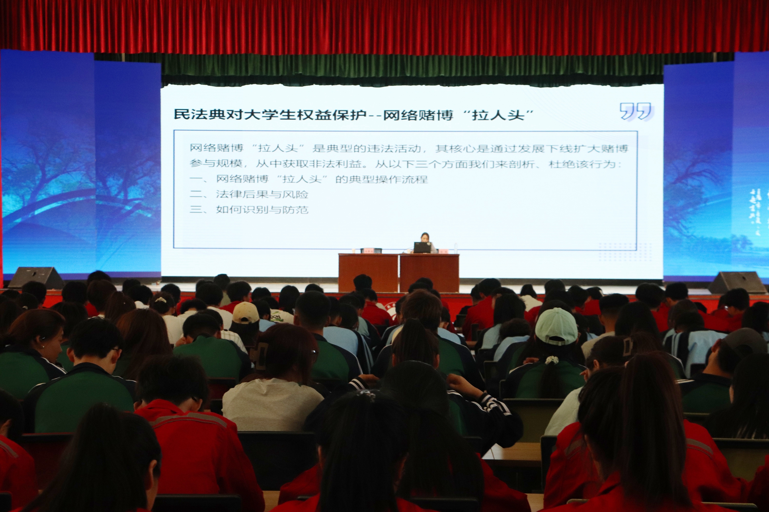 讲座中,张姝从民法典编纂的艰辛历程、民法典与大学生的权益保护、财产权利保护、人身权利保护、合同权利保护、知识产权保护、侵权责任应对、维权途径与法律等八个方面向广大学生进行了详细的宣传教育。并结合校园生活中的常见案例,如禁止高利放贷、网络赌博“拉人头”的典型操作流程、校园霸凌、交通事故等,深入浅出地讲解了民法典中与大学生密切相关的法律知识,引导同学们树立正确的法治观念,学会运用法律武器维护自身合法权益,进一步增强了学生的法治观念和法治精神。