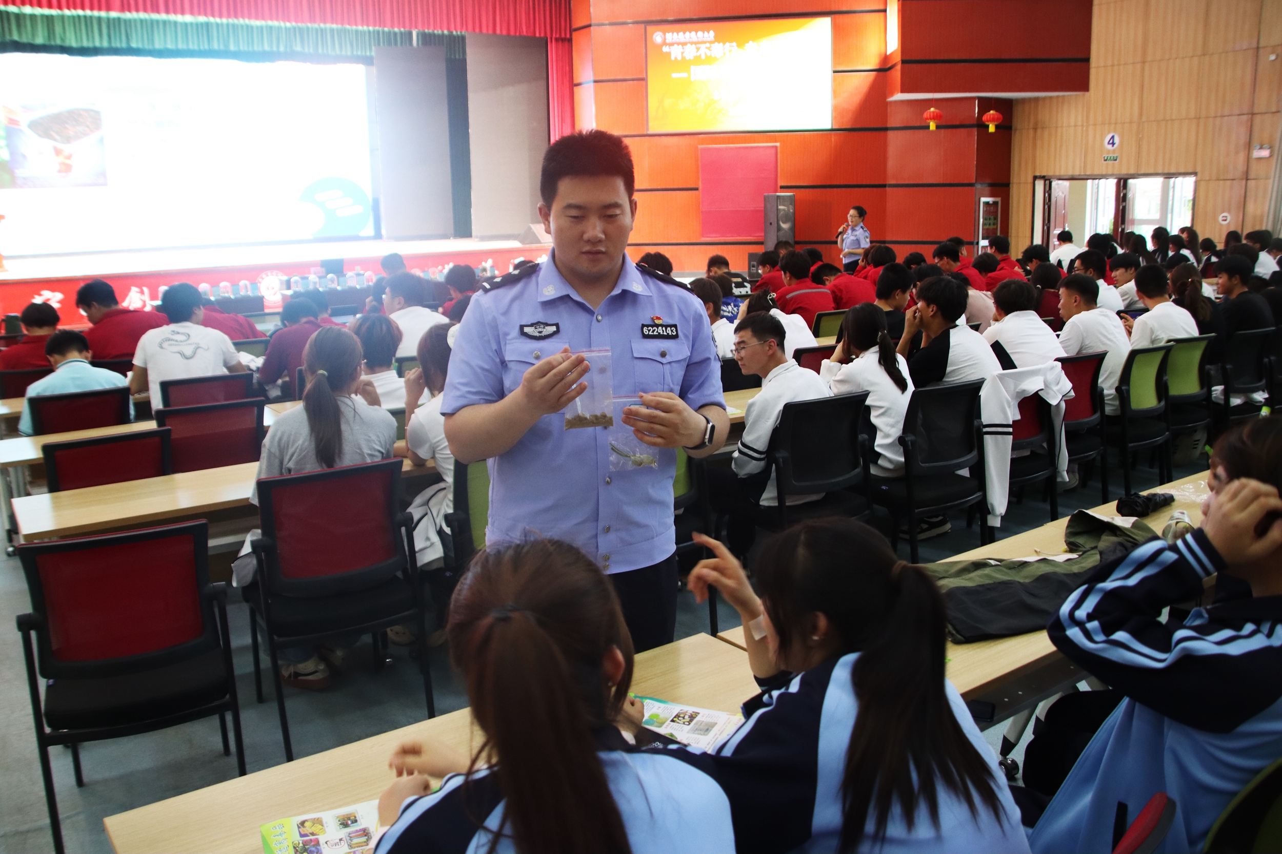 最后,在仿真毒品模型宣传展示区,民警对常见毒品的外观、特性及危害进行逐一讲解,让同学们感受到毒品对个人、家庭和社会造成的严重危害,在他们心中筑牢防毒的坚固长城。