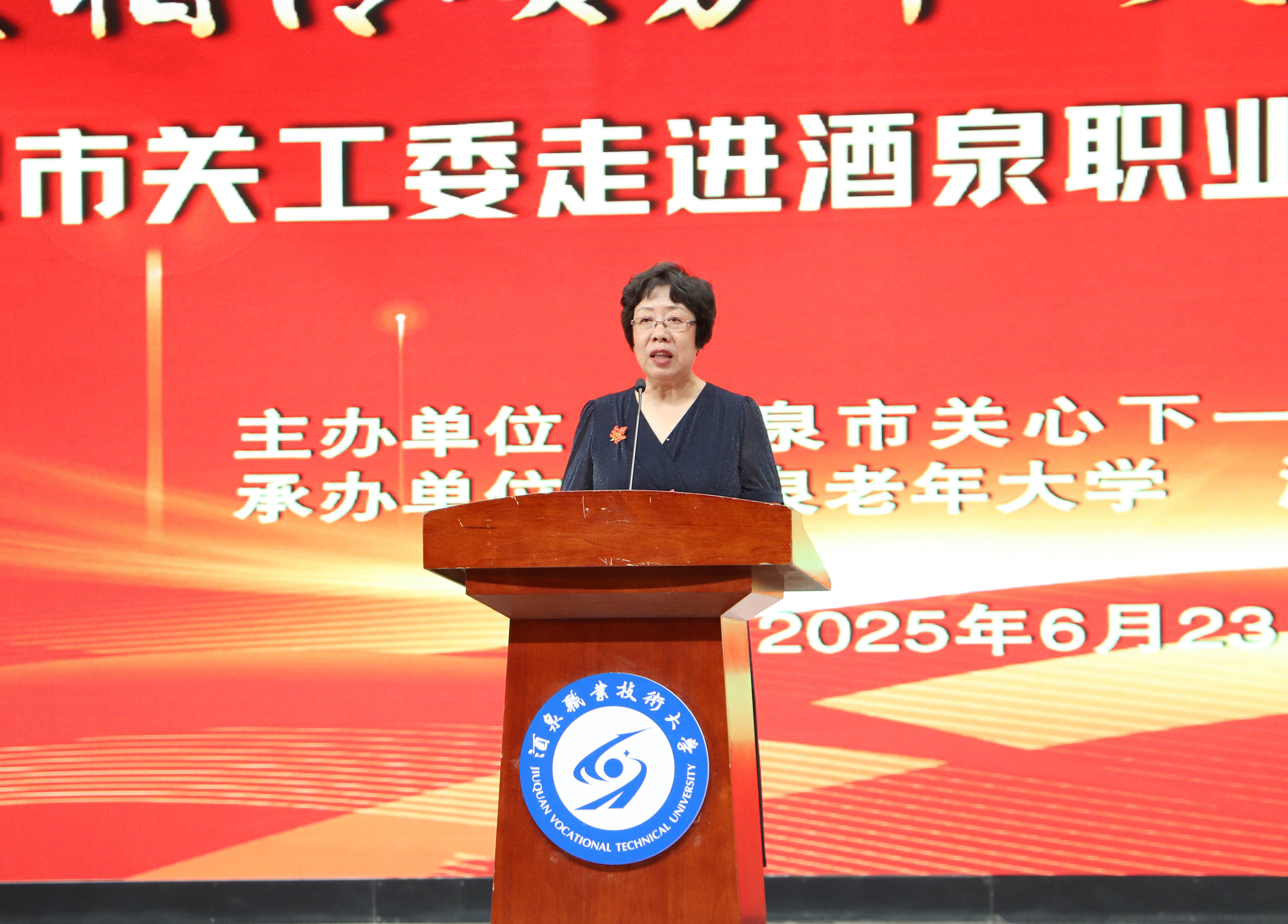 要闻快递 > 正文2025年6月23日,“薪火相传颂芳华·关爱护航润青春”主题文艺演出在学校胡杨文化中心成功举行。本次活动由酒泉市关心下一代工作委员会、酒泉老年大学主办,酒泉职业技术大学承办。酒泉市政协原副主席,一级巡视员,市关工委副主任任晓敏,学校党委副书记、校长许军,酒泉市委组织部副部长、市委老干部局局长、市关工委副主任王建宏,酒泉市教育局局长、市关工委副主任杨界德,学校党委委员、副校长施荣等相关领导出席活动。500余名师生代表观看演出,共同感受代际传承的精神力量。
