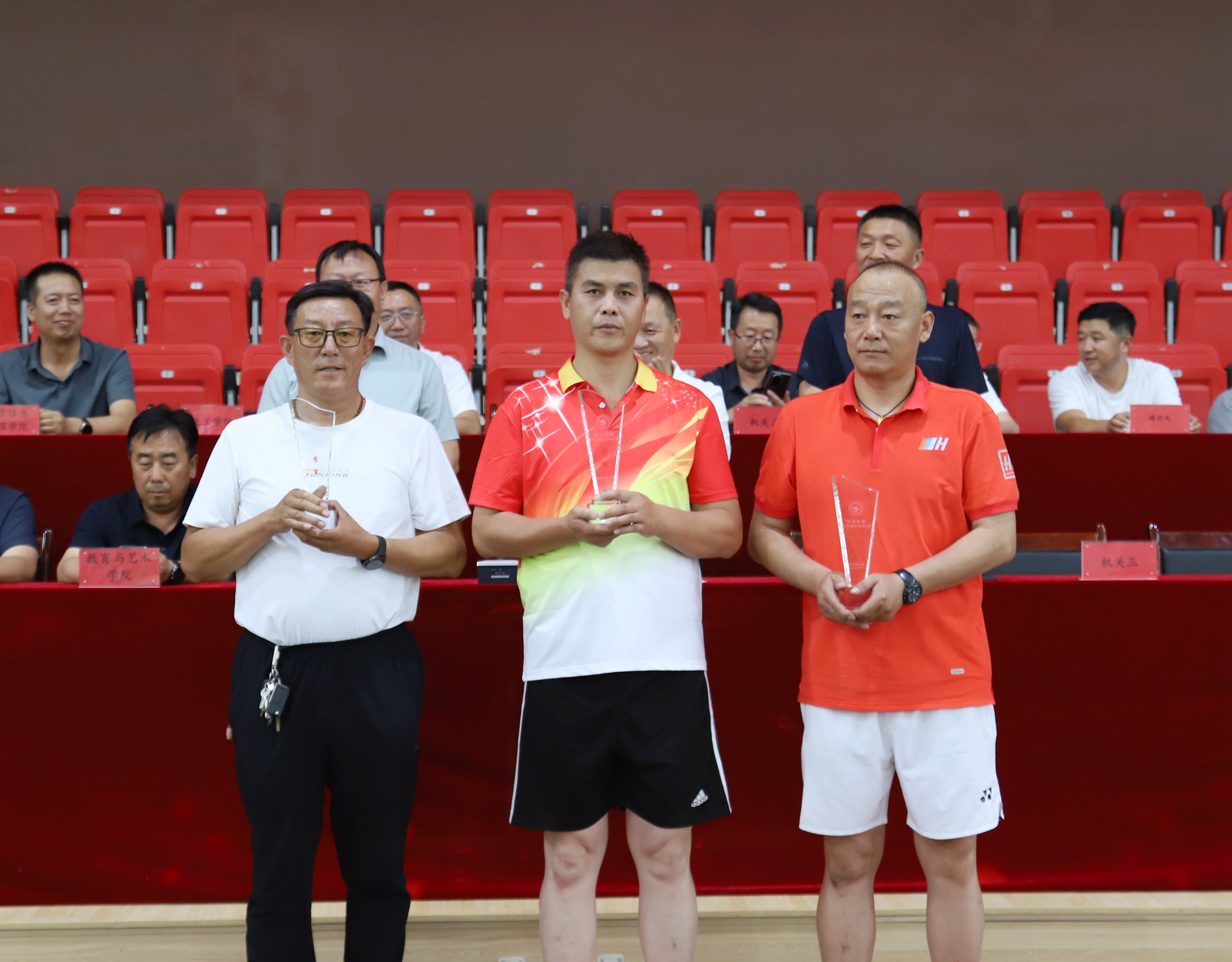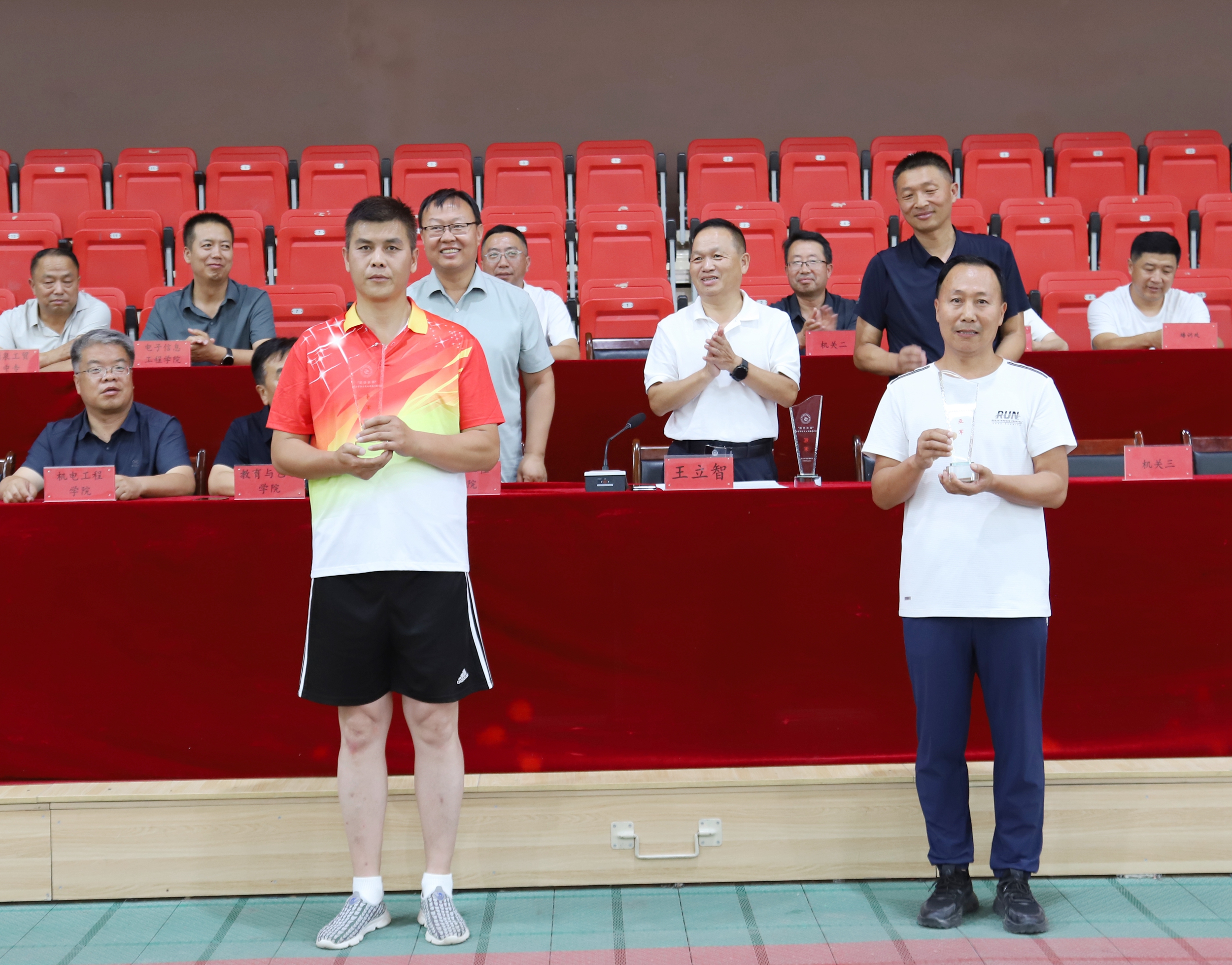 王立智宣读了球类体育联赛各项赛事获奖情况,并为教职工棋类比赛、乒乓球团体赛、排球比赛获奖个人和单位进行了颁奖。生物工程学院获得中国象棋比赛冠军、酒泉工贸中等专业学校获得中国象棋比赛亚军、体育与健康学院获得中国象棋比赛季军。培训处获得围棋比赛冠军、酒泉卫生学校获得围棋比赛亚军、教育与艺术学院获得围棋比赛季军。化工学院获得乒乓球团体比赛冠军、生物工程学院获得乒乓球团体比赛亚军、机关二分工会联队获得乒乓球团体比赛季军。机关二分工会联队获得排球比赛冠军、酒泉卫生学校一队获得排球比赛亚军、酒泉工贸中等专业学校一队获得排球比赛季军。