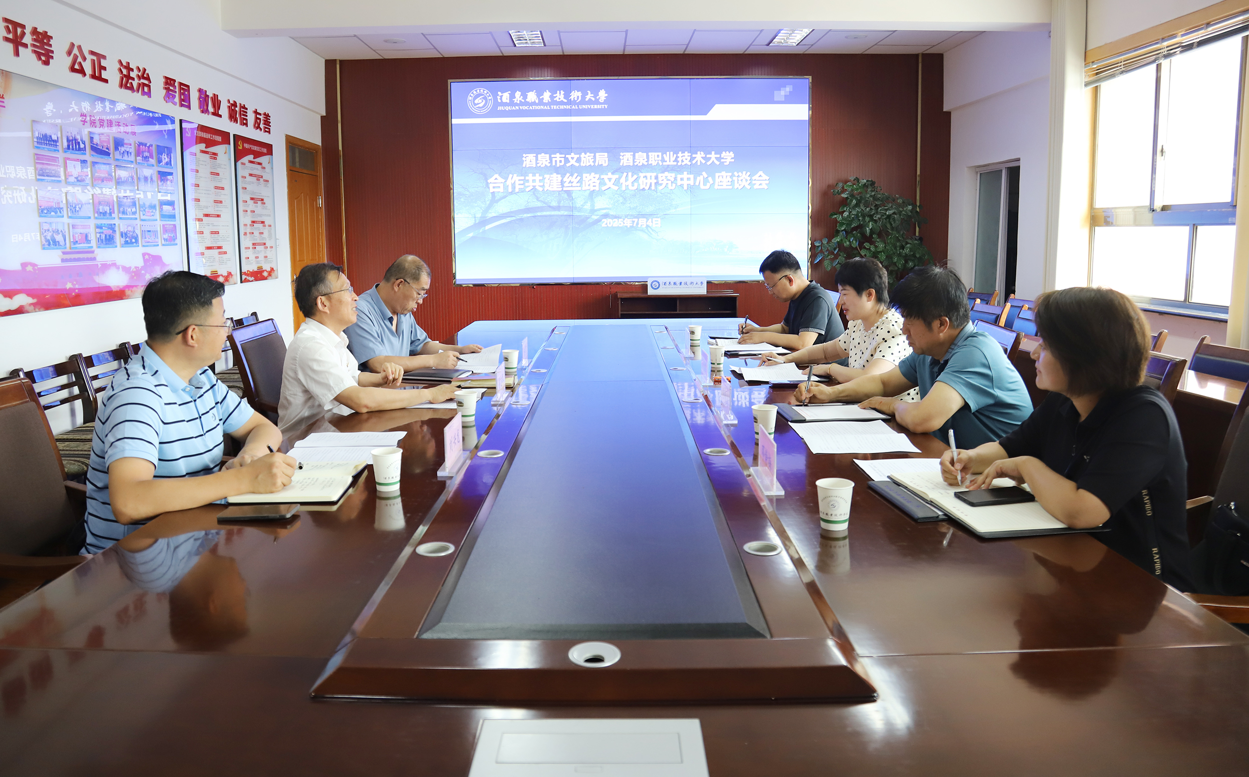 2025年7月4日下午,酒泉市文体广电和旅游局党组书记、局长马慧君一行在学校行知楼4楼会议室,就深化政校合作、共建丝路文化研究中心(图书馆)开展座谈交流。学校党委书记易志军,党委副书记、校长许军出席会议。