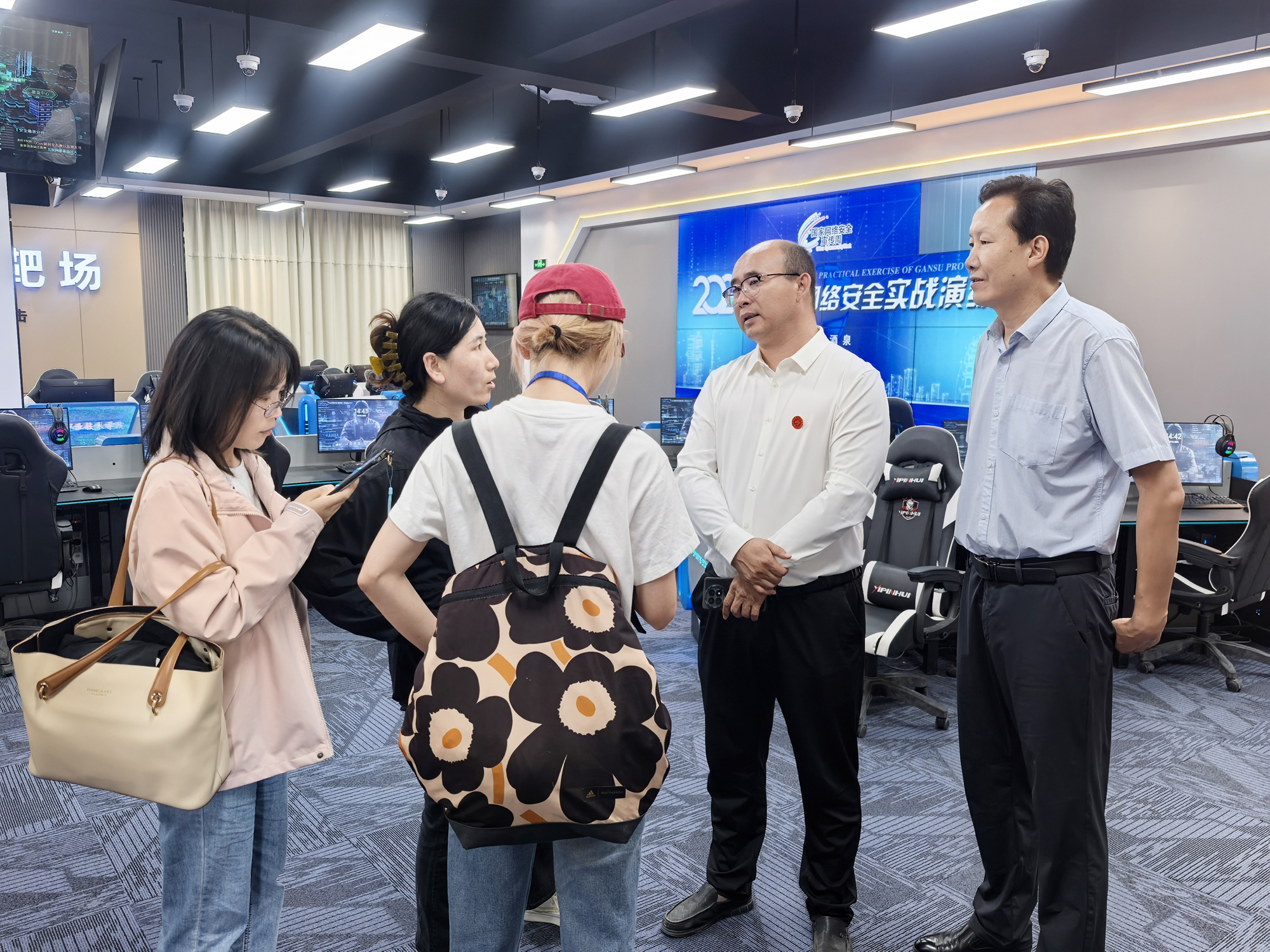 参观结束后,采访团对副校长杨洁进行了现场专访,杨洁系统介绍了学校在网络安全领域的建设理念、实践路径与发展规划。他表示,学校把握时代脉搏,整合优势资源成立电子与信息工程学院,先后开设了人工智能、信息安全、物联网等前沿专业,形成信息技术专业群,打造了高度仿真的网络攻防演练环境“大数据安全靶场”,并与国内网络安全企业360建立深度合作关系,共建360数字安全产业学院,共建课程、共编教材、共研项目,又与兰州大学三家牵头成立了全国人工智能+安全(数字安全)产教融合共同体。今后,学校将持续深化内涵建设,不断更新课程内容,引进和培养高水平师资,升级优化靶场平台,保持技术前沿性,与更多企业、科研机构、政府部门建立紧密合作,共同探索应对复杂多变的安全挑战策略,为培养堪当大任的网安尖兵、护航数字中国建设贡献坚实的‘酒泉力量’!
