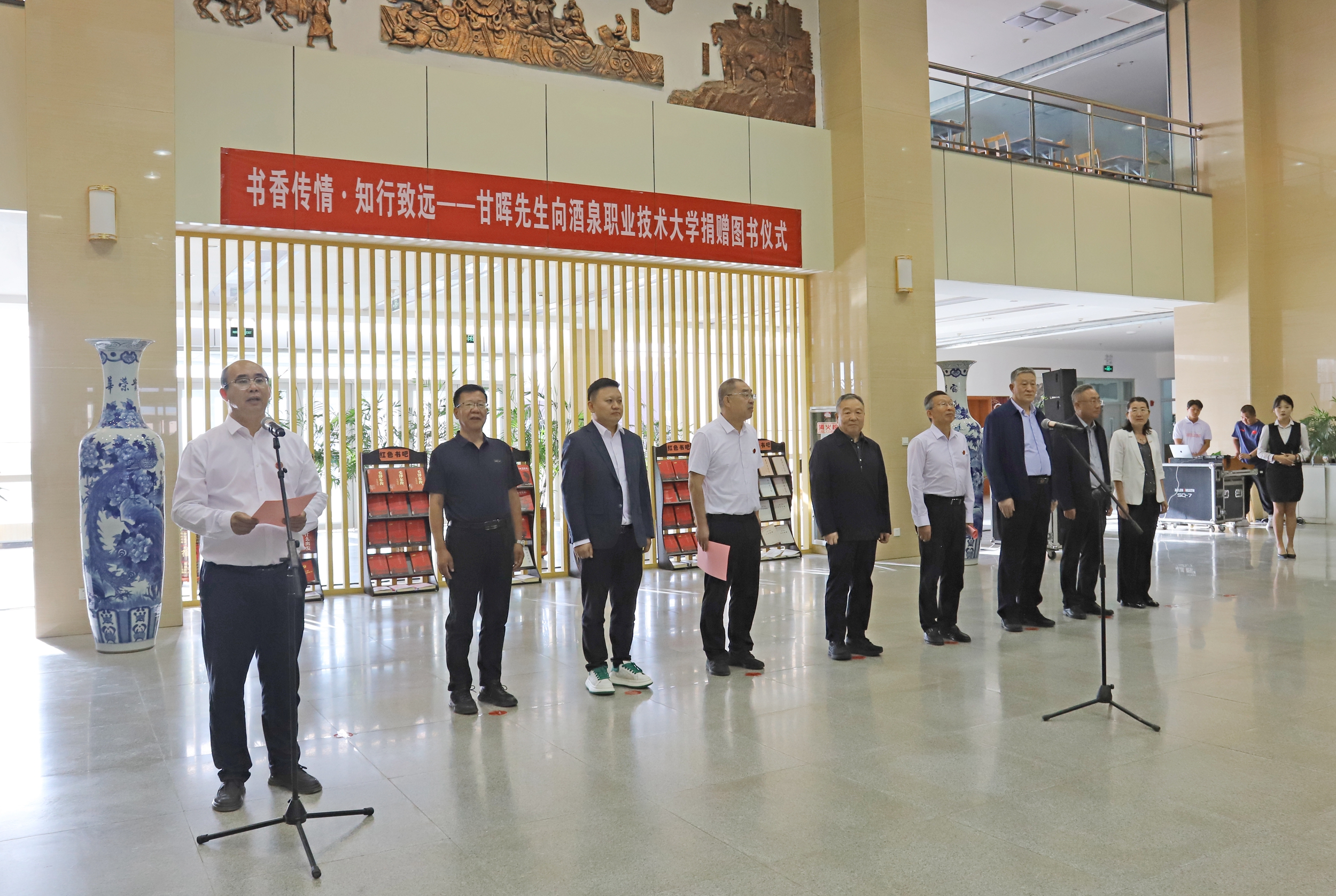 2025年9月8日上午,“书香传情・知行致远--甘晖先生向酒泉职业技术大学捐赠图书仪式”在学校图书馆二楼大厅举行。此次活动以图书为纽带,串联起知识传递与文化传承,更为校际交流搭建新平台。陕西师范大学原党委书记、陕西省社科联主席、陕西师范大学“一带一路”文化研究院院长甘晖,原陕西省司法厅副厅长韩旗,陕西工科教育投资发展有限公司董事长陈福泽莅临现场。学校党委书记易志军,党委副书记、校长许军,党委委员、副校长王金明,党委委员、宣传统战部部长李文有等出席活动。党委委员、副校长杨洁主持。