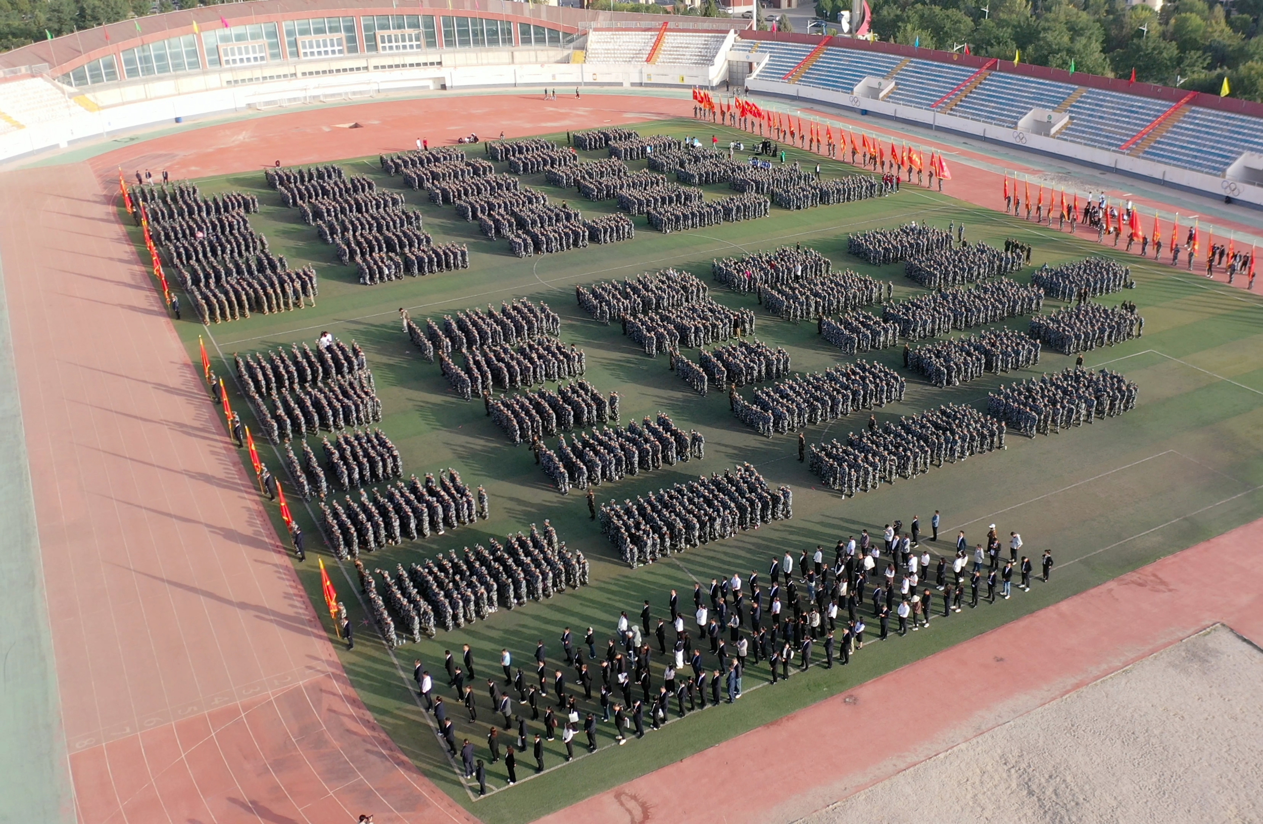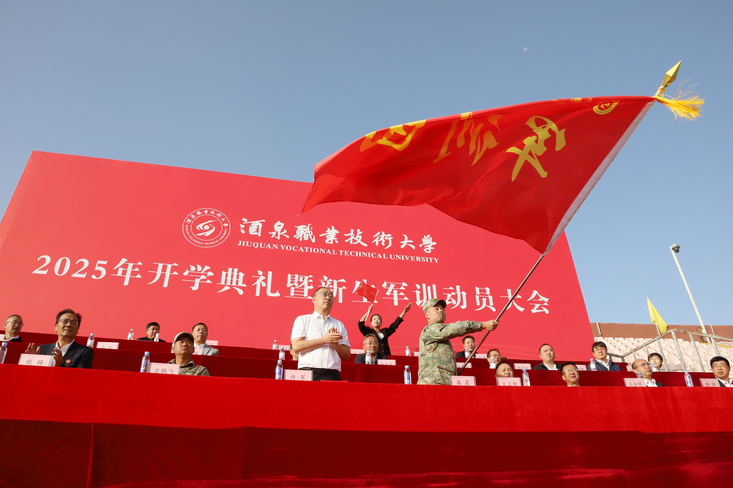 金秋时节,硕果盈枝。2025年9月13日,酒泉职业技术大学举办2025年开学典礼暨新生军训动员大会。94005部队机关参谋高晨、96114部队少校营长古鹏飞,酒泉职业技术大学党委副书记、校长许军及校党委班子成员,企业代表、优秀校友代表甘肃九鼎风电科技有限公司总经理孙宏伟出席大会。党委委员、副校长施荣主持。4800多名新同学齐聚体育场参加大会。
