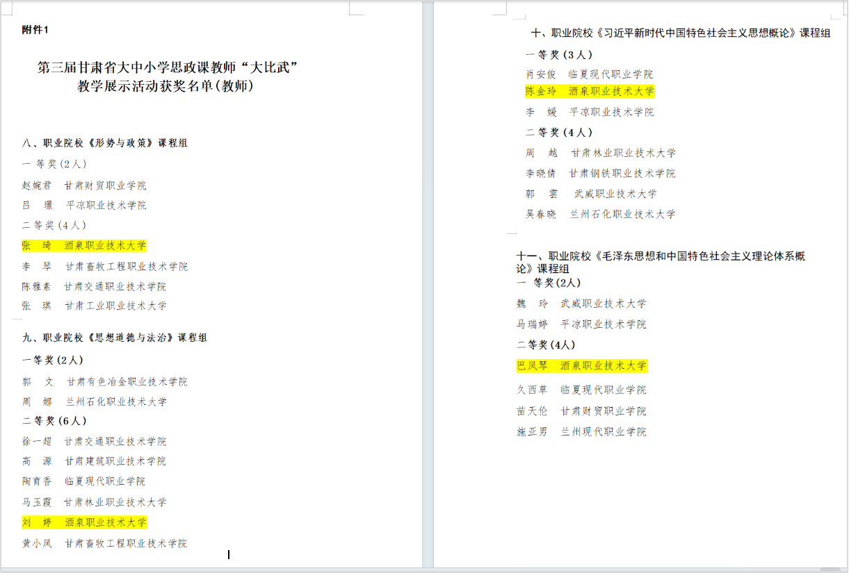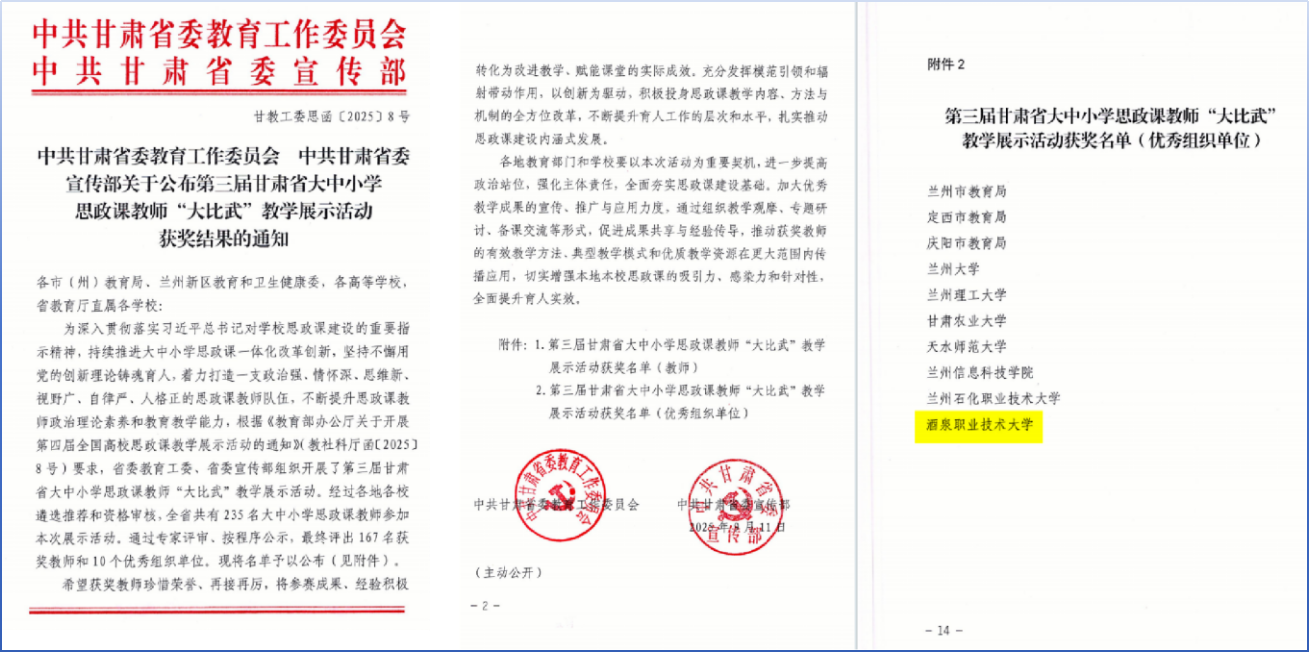 本次教学展示活动汇聚了全省大中小学的235名优秀思政课教师。我校4位参赛教师凭借深厚的理论素养、严谨的教学设计和出色的现场表现,获得了评委的高度认可。其中,陈金玲老师获得高职《习近平新时代中国特色社会主义思想概论》课程组一等奖,并代表甘肃省参加第四届全国高校思政课教学展示活动;张琦、刘婷、巴凤琴老师分获高职《形势与政策》《思想道德与法治》《毛泽东思想和中国特色社会主义理论体系概论》课程组二等奖,充分展现了我校思政课教师扎实的教学功底和优秀的专业素养。