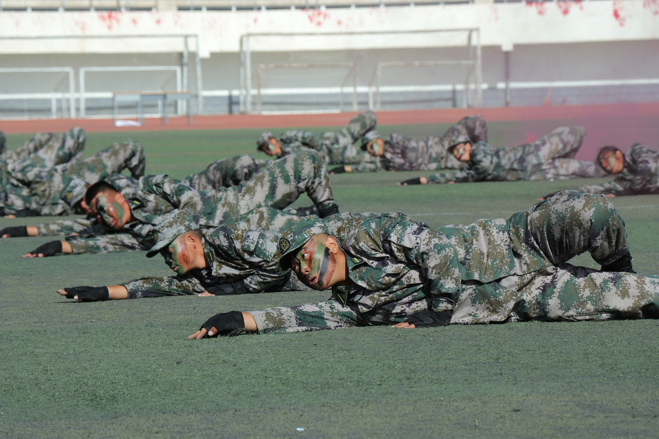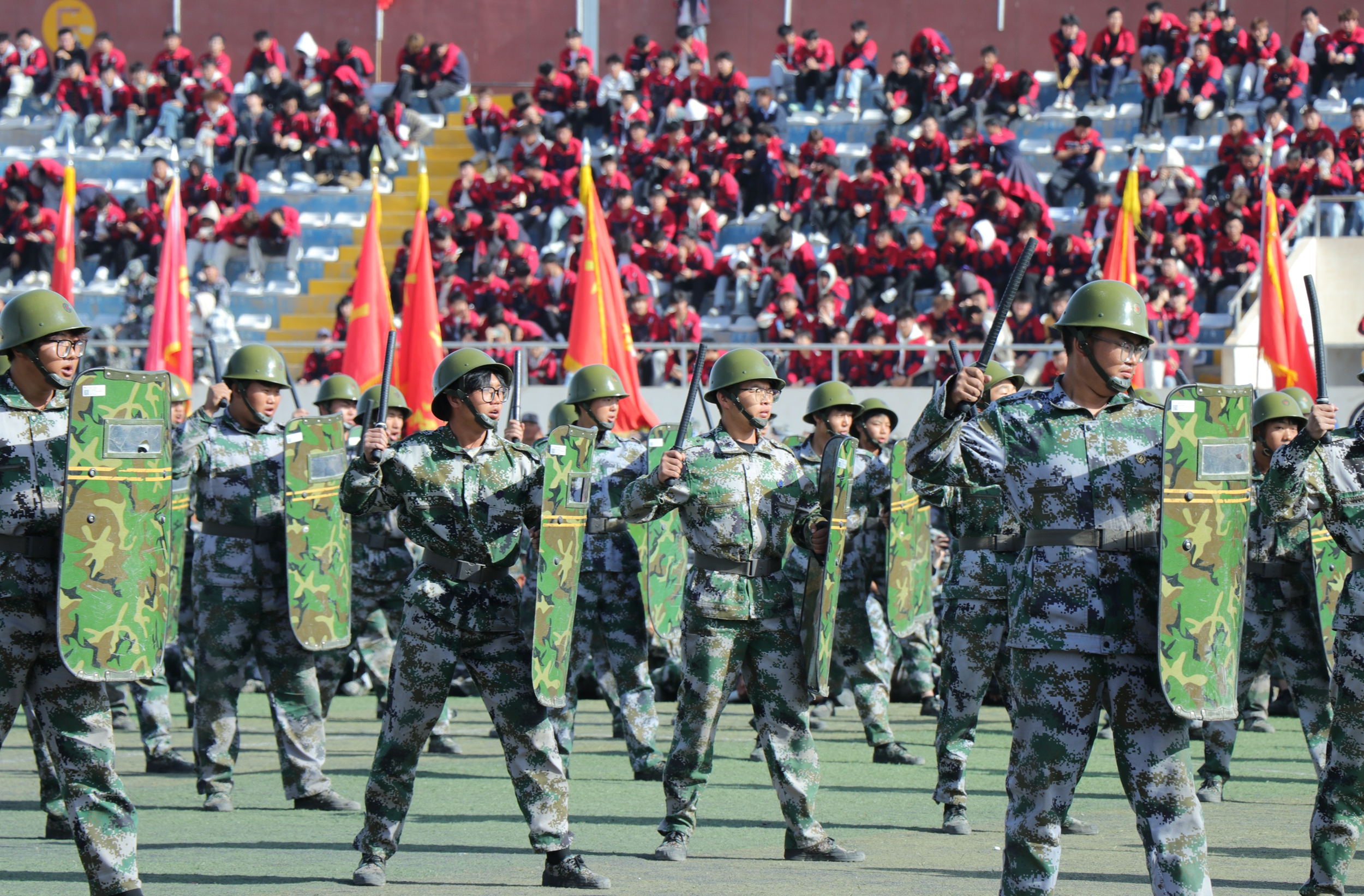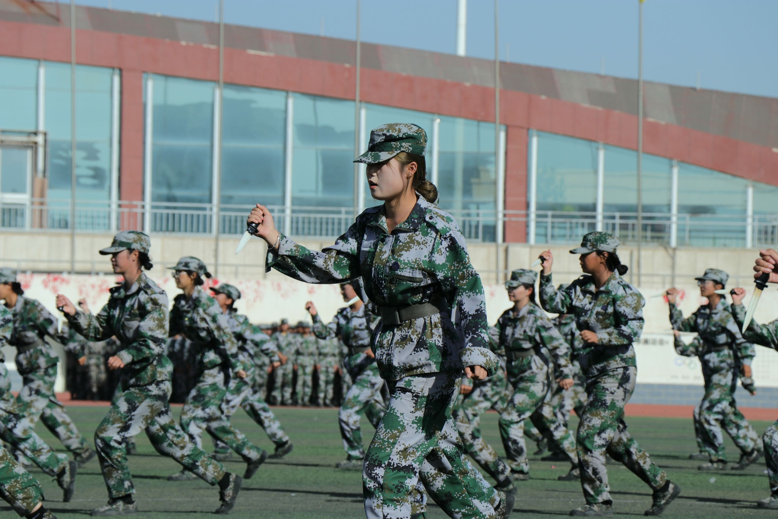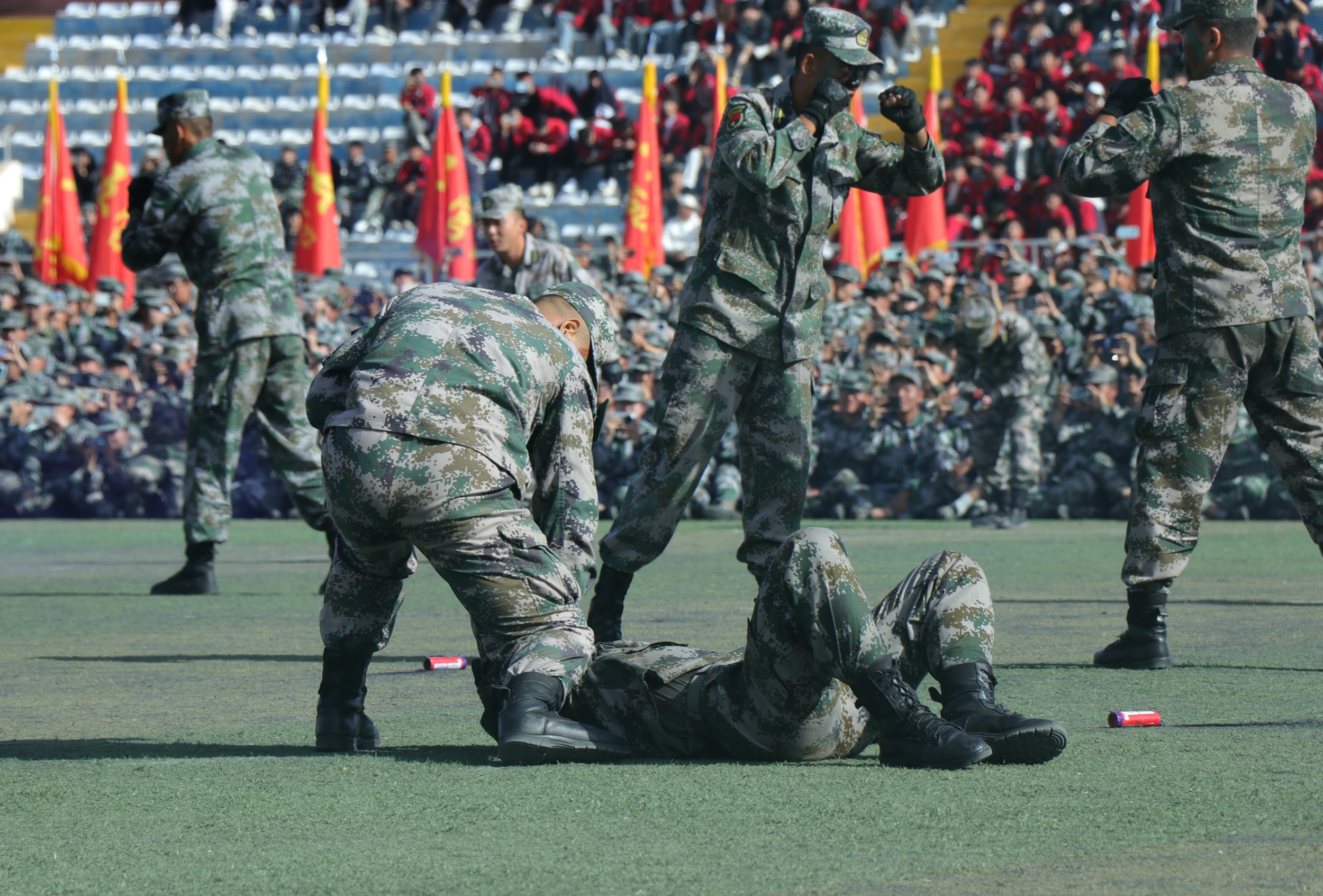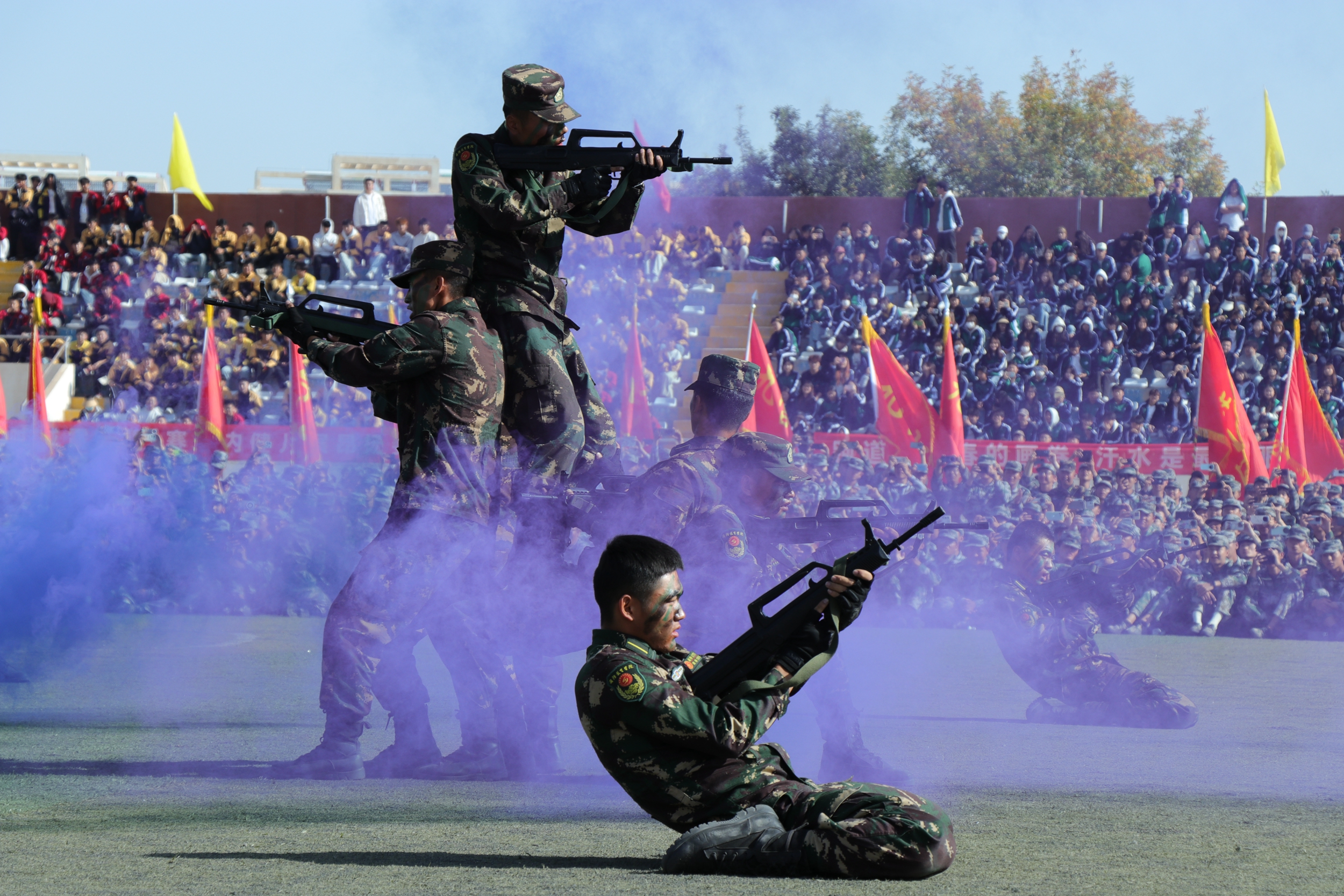 随着激昂的音乐响起,匕首操方阵迈着铿锵步伐入场,同学们手持训练匕首,眼神锐利而坚定。弓步刺出、格挡防守、转身侧刺,身体旋转间动作连贯流畅,没有丝毫拖沓,将“柔中带刚”的风采展现得淋漓尽致。刚劲有力、迅猛凌厉的军体拳,攻防兼备、威武雄壮的警棍盾牌操,展示的不仅是技能,更是毅力、协作与勇气的完美诠释。国防教育学院教官带来了一场极具专业性与实战感的军事技战术表演,以过硬的军事素养与默契的协同作战能力,让新生们沉浸式体验了实战化战术的魅力,赢得现场阵阵欢呼与掌声。