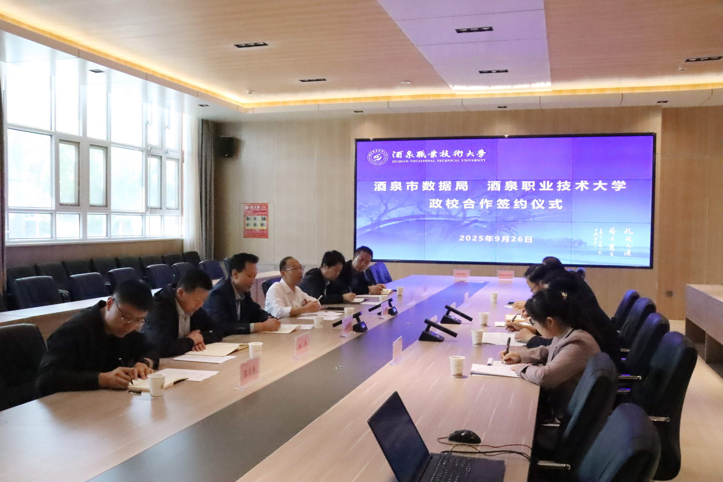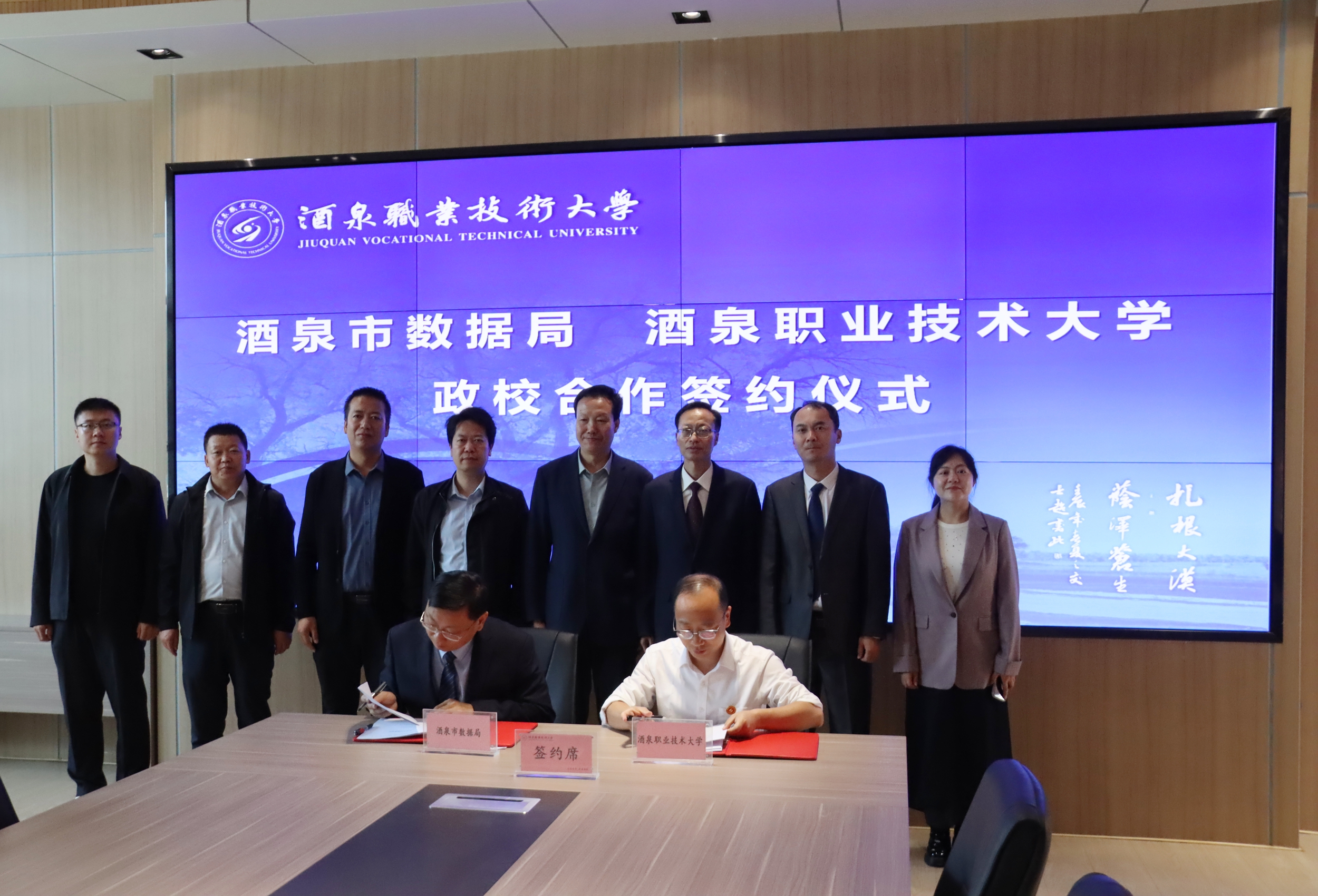 2025年9月26日,酒泉市数据局与我校在弘毅楼德馨厅举行签约仪式。酒泉市数据局党组书记、局长车将胤,学校党委委员、副校长高翔出席签约仪式。数据局副局长段海强、杨芯,教师发展中心、电子与信息工程学院领导参加了签约仪式。