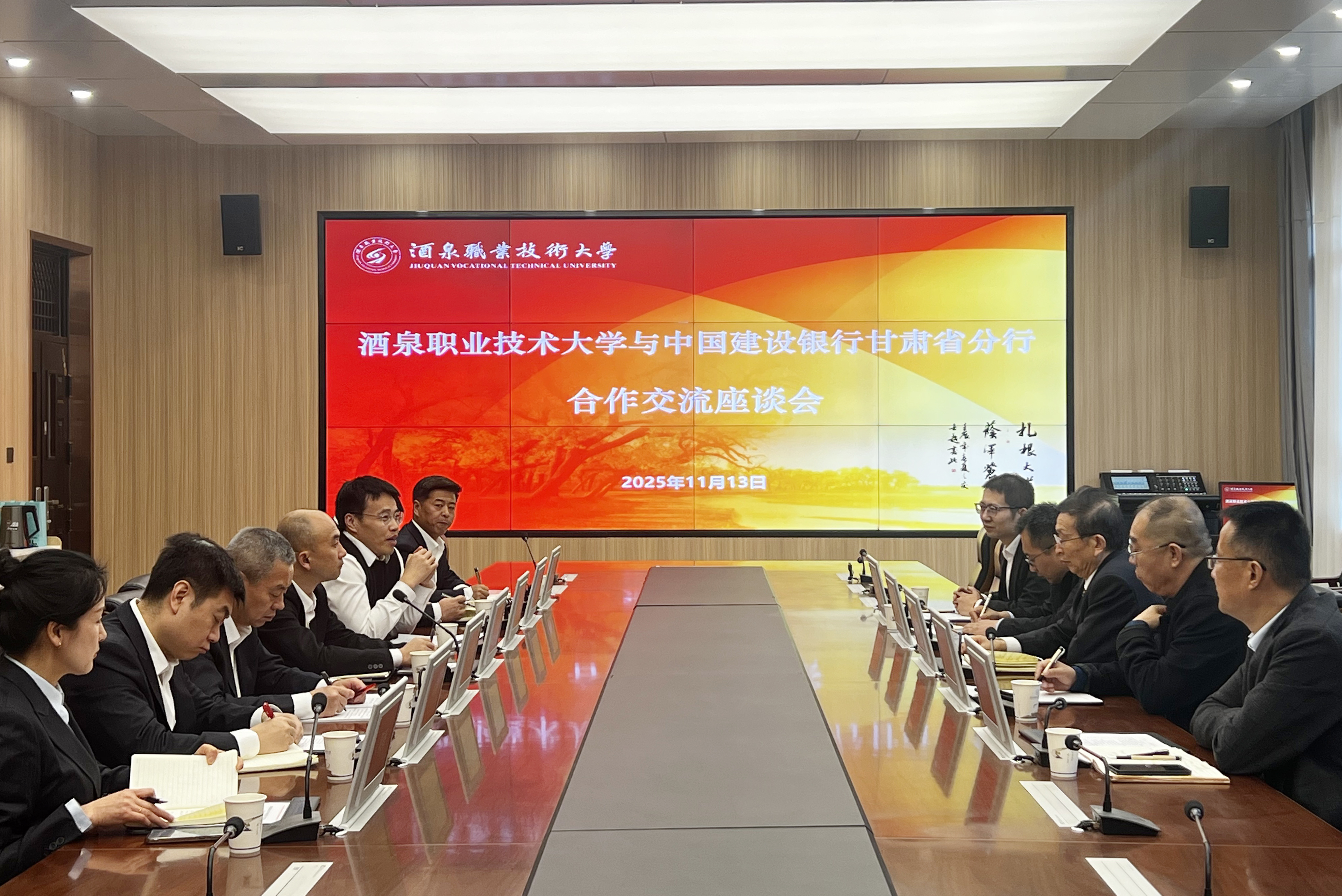 2025年11月13日,酒泉职业技术大学与中国建设银行甘肃省分行合作交流座谈会在学校静远厅召开。双方围绕“强化银校合作、推动资源共享、实现优势互补”的主题展开深入交流,旨在通过深化合作,共同探索金融支持职业教育高质量发展的创新路径。
