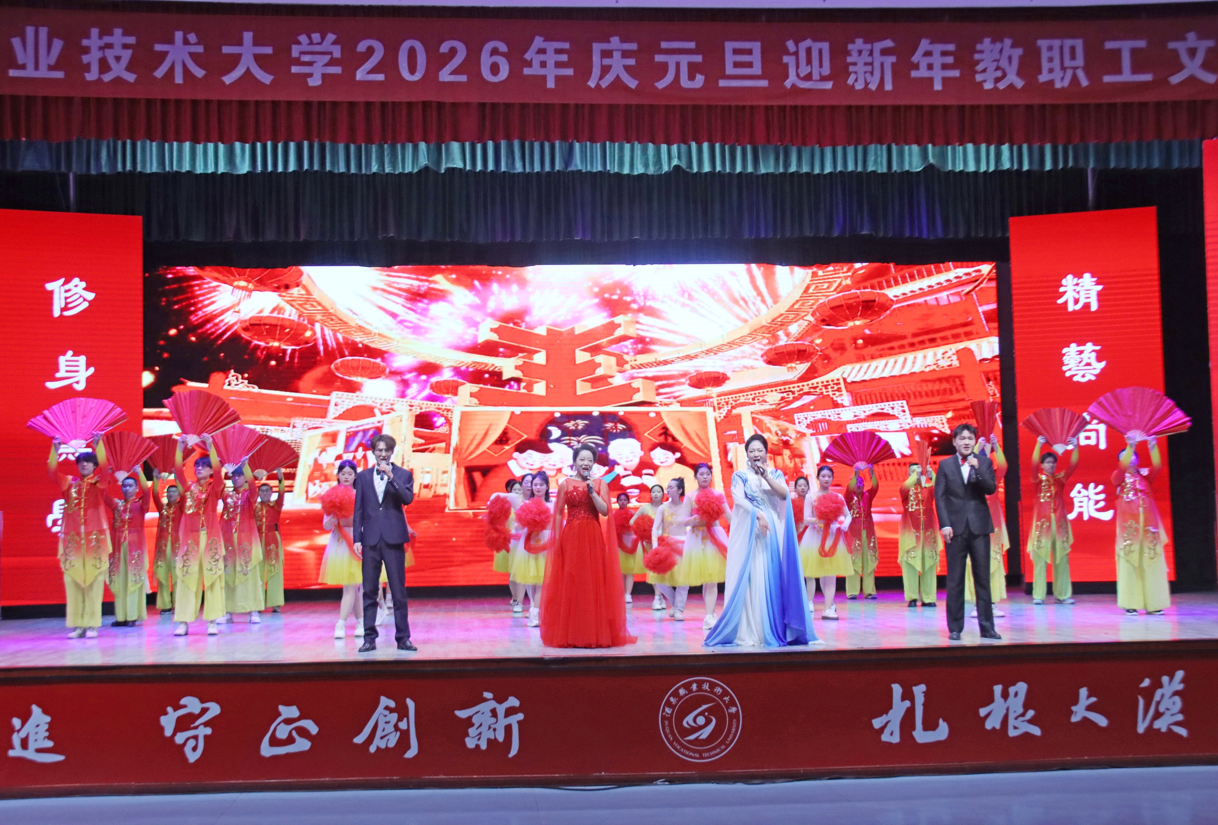 晚会在序章“星火启程向未来”拉开帷幕,灯光璀璨中,教职工们以饱满的热情、昂扬的姿态,展现出全校师生锐意进取、奔赴未来的精神风貌。第一篇章“根脉深·初心如磐践使命”,聚焦教育初心与责任担当,展现教职工们扎根专业、勇攀高峰的信念与决心。第二篇章“百花兴·岗位深耕绽芳华”,展现了教职工们在不同岗位上的责任与担当、创新与活力。第三篇章“聚力行·同心共赴新征程”,教职工们用激昂的旋律、豪迈的舞姿,展现团结奋进、共迎新年的豪情,将晚会气氛推向高潮。