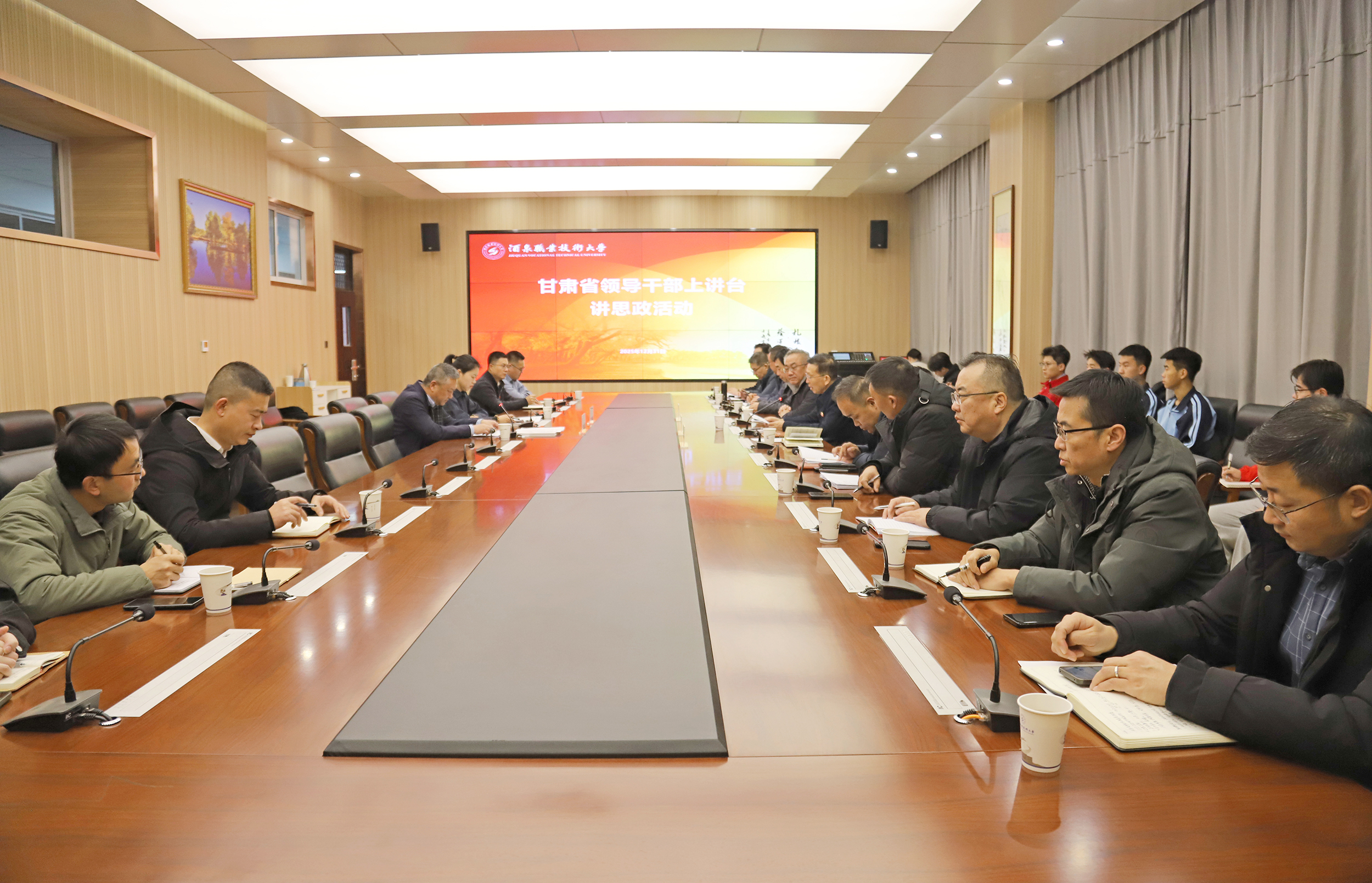 要闻快递 > 正文为深入学习贯彻党的二十届四中全会精神和习近平总书记关于学校思政课建设的重要指示,完善党政领导干部进校园开展思想政治教育长效机制。2025年12月31日,甘肃省侨联党组成员、副主席、秘书长安亚军受邀来校,为师生带来一堂思想政治理论课。省侨联办公室三级主任科员陈君、酒泉职业技术大学党委书记易志军、党委副书记王立智等出席活动。学校各学院党支部书记和副书记、学生干部代表参加活动。