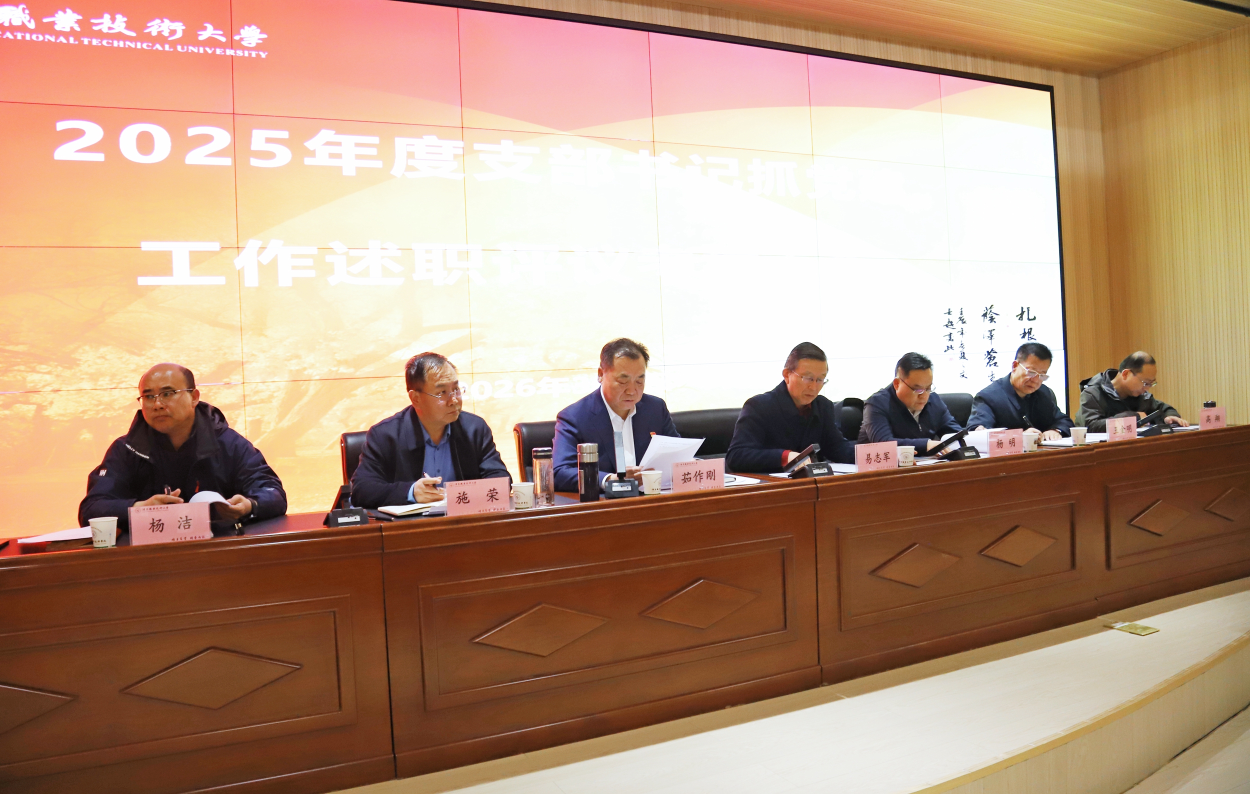 大会采取现场述职和书面述职相结合的方式进行。6位党支部书记围绕2025年度抓党建工作情况、存在问题和下一步工作思路进行了现场述职。易志军逐一进行了点评,既肯定了工作特色和成绩,也点明了未来改进思路和方向。其他党支部书记进行书面述职,并进行了民主评议。