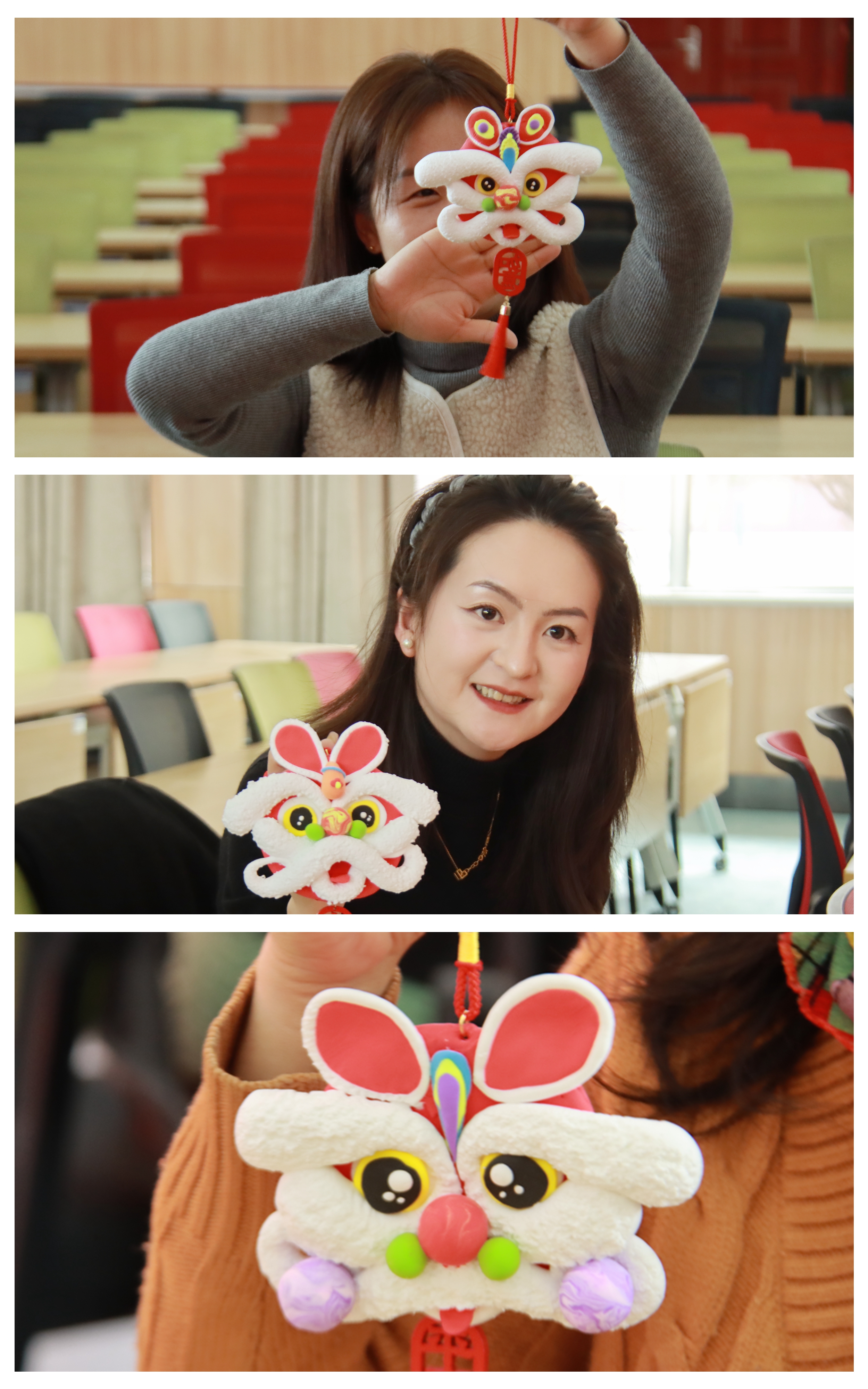 女教职工们热情高涨、兴致盎然,纷纷拿起五彩面团,跟着老师的步骤认真创作。揉面塑形、雕琢眉眼、粘贴鬃毛与铃铛,一边交流心得,一边用心勾勒,在指尖的揉捏雕琢中,感受传统手艺的温度与巧思。原本普通的面团,在大家的巧手下变成一只只威风灵动、形态各异的醒狮面塑,每一道纹路都藏着吉祥寓意,每一次塑形都是文化传承,这不仅是手工体验,更是一场非遗文化之旅。