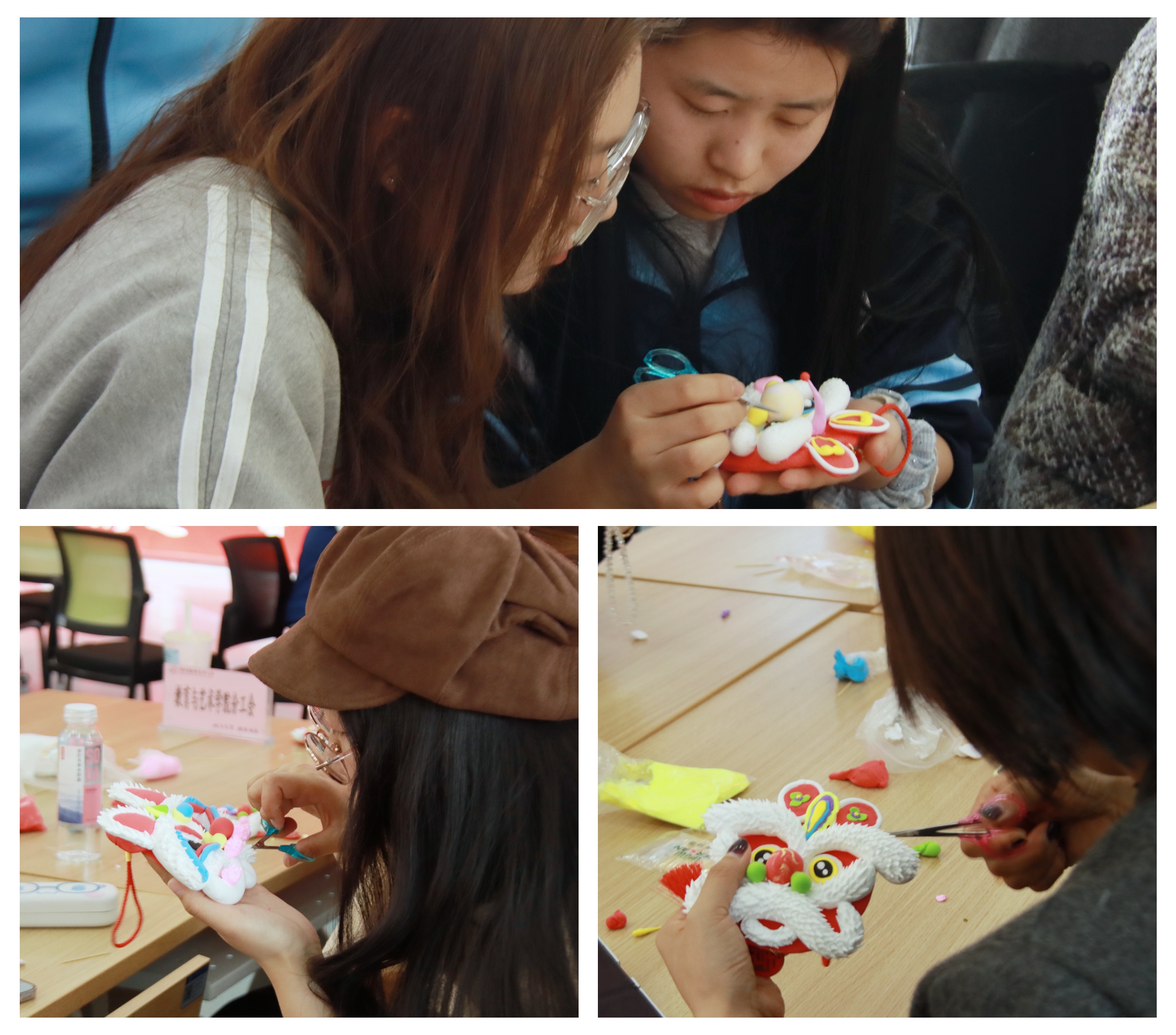 活动现场,宋雪娇老师为大家讲授醒狮踏春面塑的制作方法。她详细讲解了醒狮在中华民俗中驱邪纳福、兴旺吉祥的美好寓意,以及民间技艺面塑流传千年的历史渊源和工艺精髓。从醒狮面塑的创作思路、色彩搭配,到揉、捏、搓、按、贴等基础手法,宋雪娇老师都进行了细致讲解和教学示范,将指尖塑万物的传神工艺分享展示。